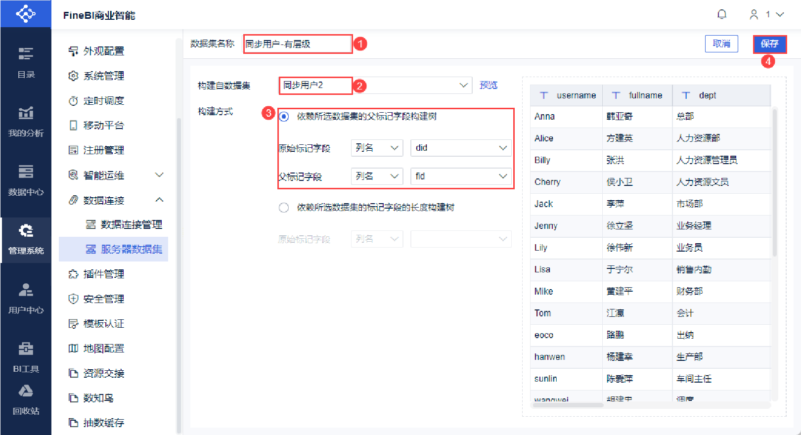 设置数据集名称为「同步用户-有层级」,构建自数据集「同步用户2」,原始标记字段为「did」,父标记字段为「fid」,如下图所示: