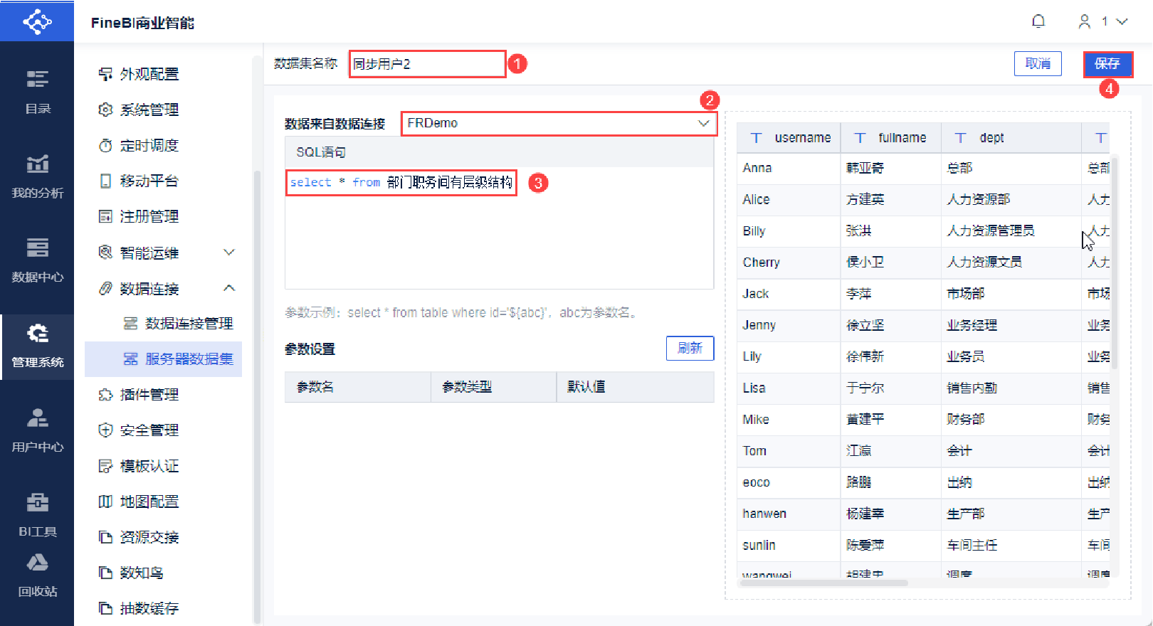 设置数据集名称为「同步用户2」,数据连接选择「FRDemo」,SQL 语句为: