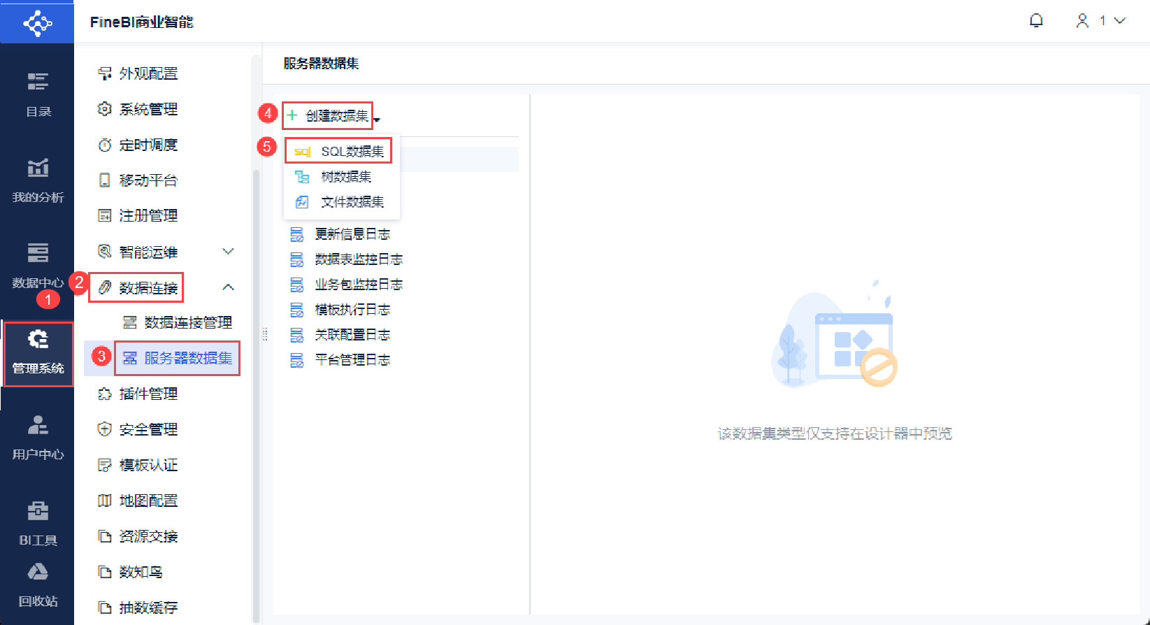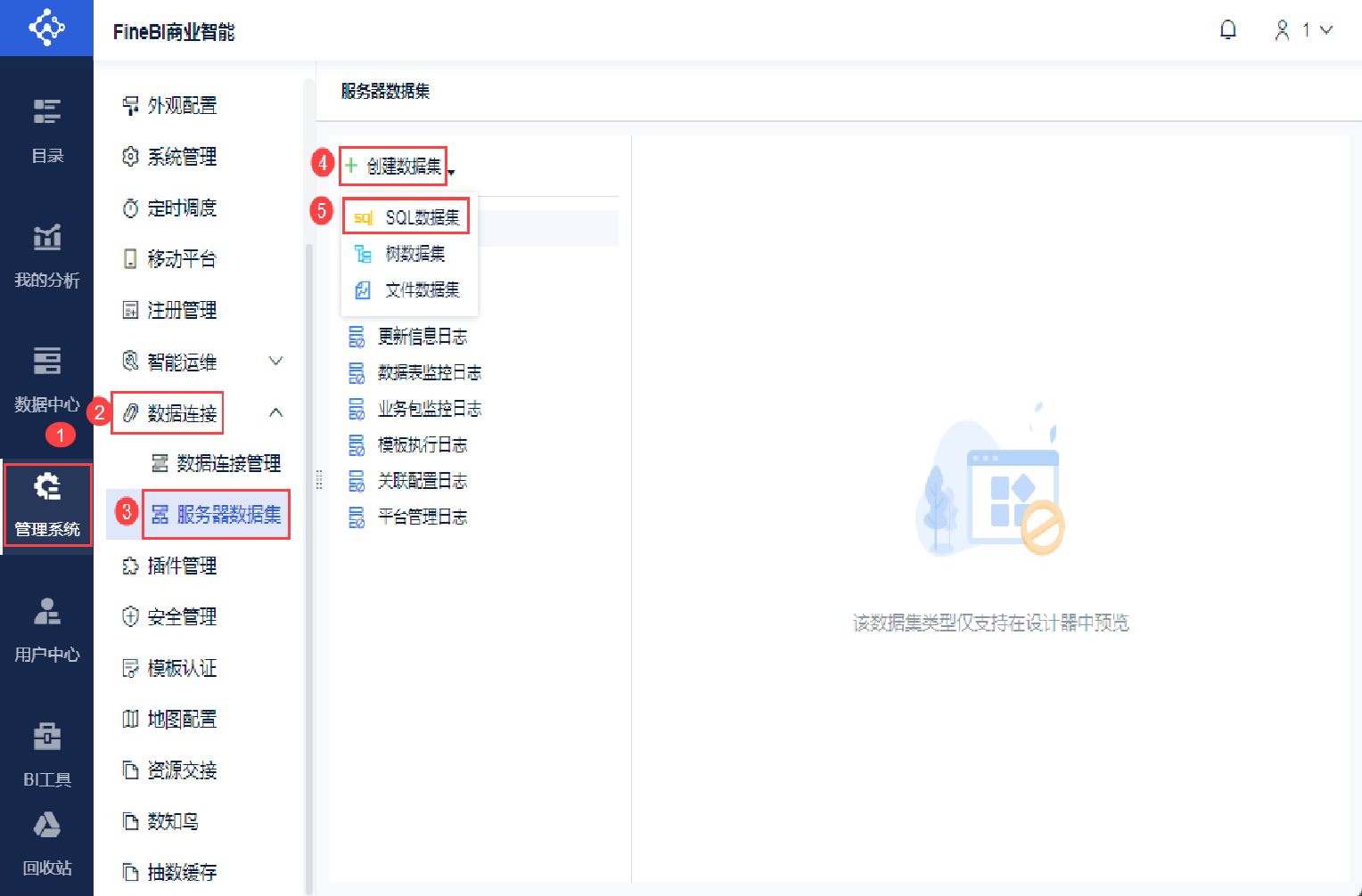 管理员登录FineBI系统,点击「管理系统>数据连接>服务器数据集」,创建「SQL数据集」。如下图所示:
