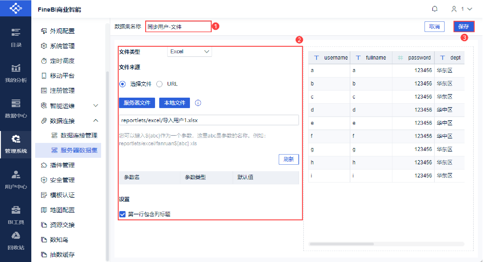 设置数据集名称为「同步用户-文件」,选择上文准备的表格。