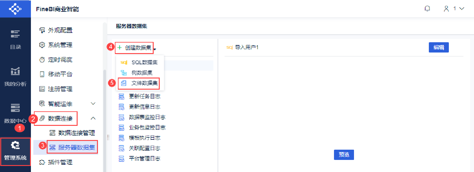 管理员登录FineBI系统,点击「管理系统>数据连接>服务器数据集」,创建「文件数据集」。如下图所示: