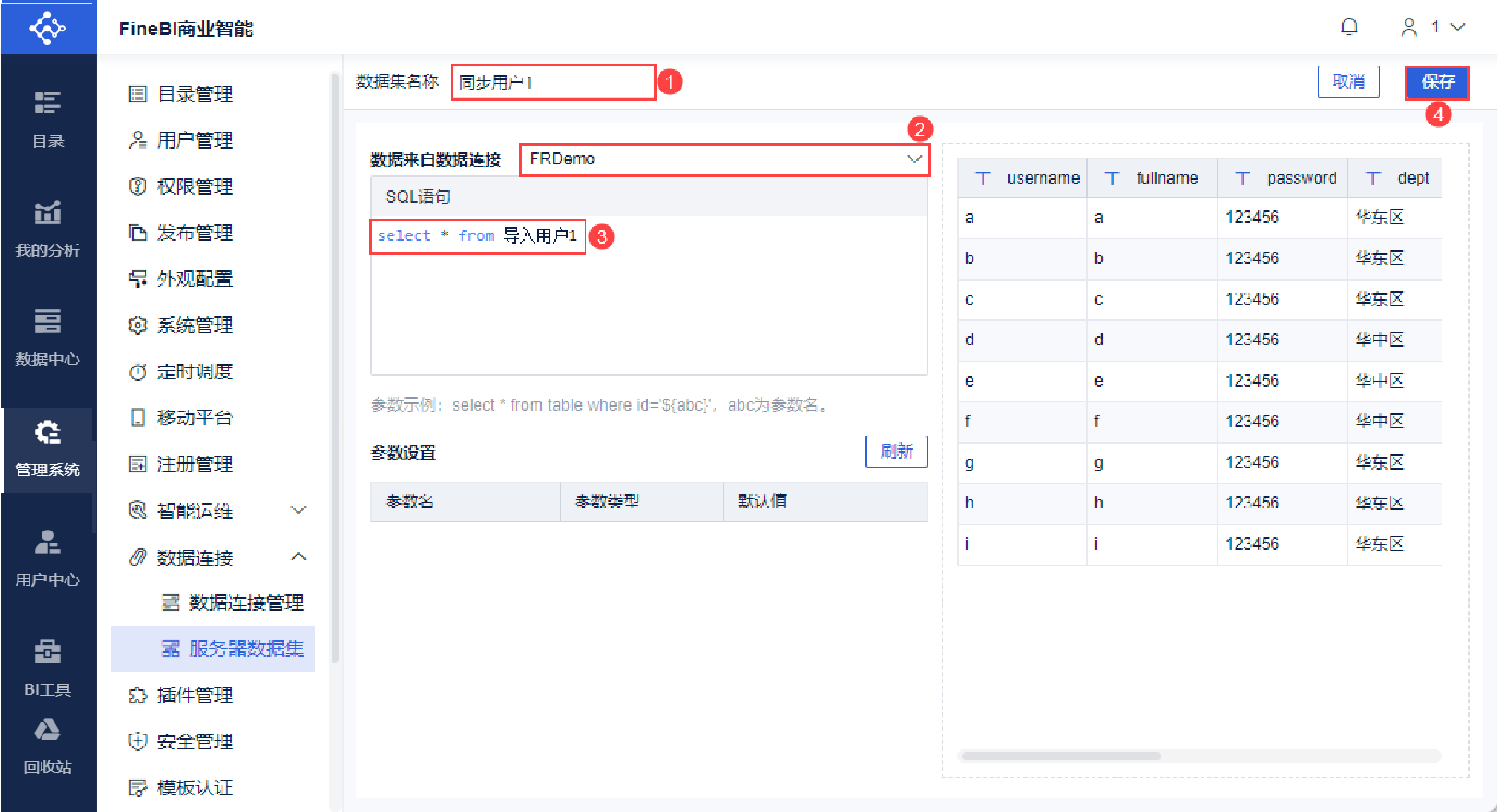 设置数据集名称为「同步用户1」,数据连接选择「FRDemo」,SQL 语句为: