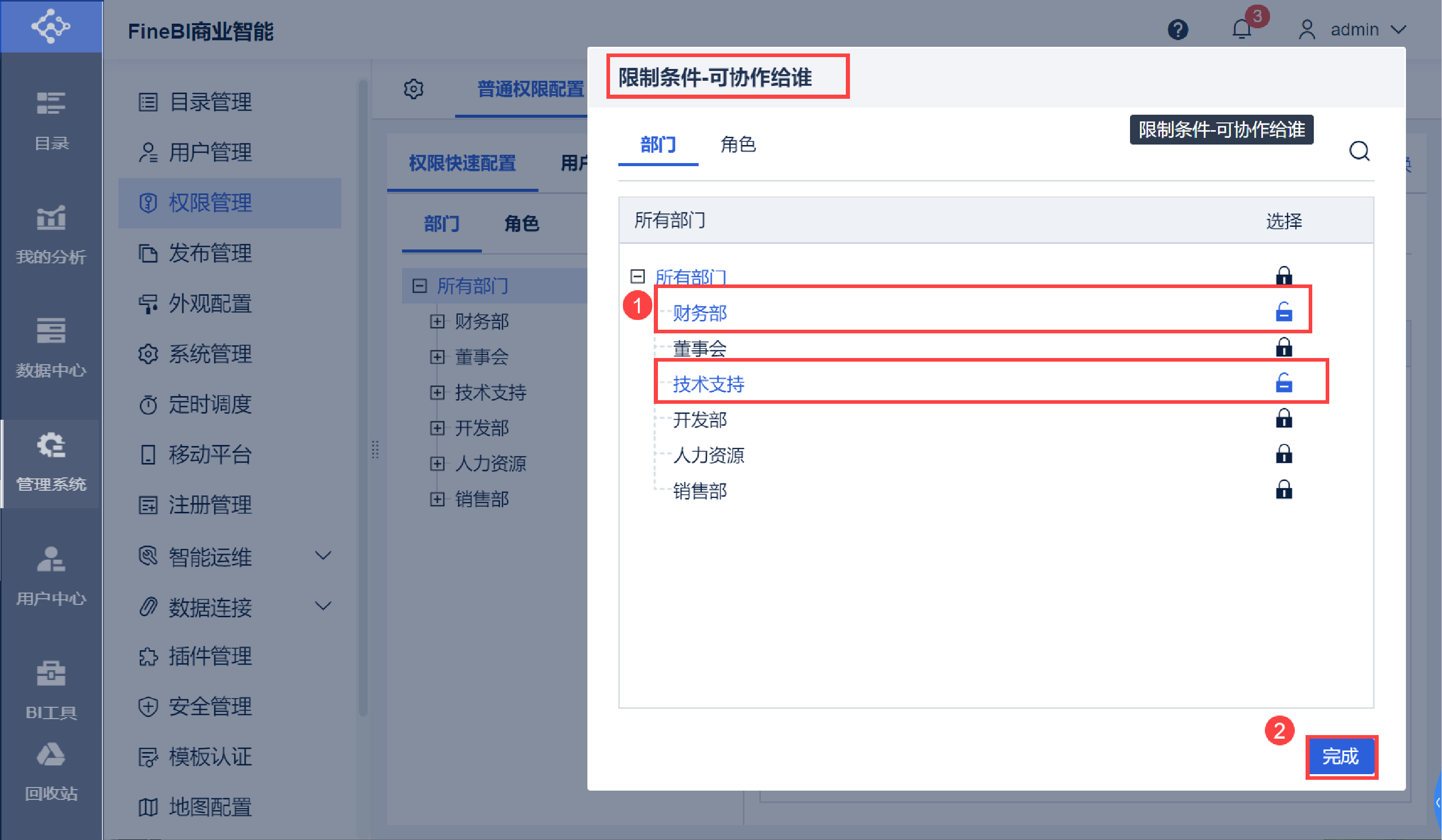 当用户已经创建了文件夹或者分析主题,管理员需要给用户分配了「资源协作」功能的使用权限(即可以将资源协作给谁),如下图所示: