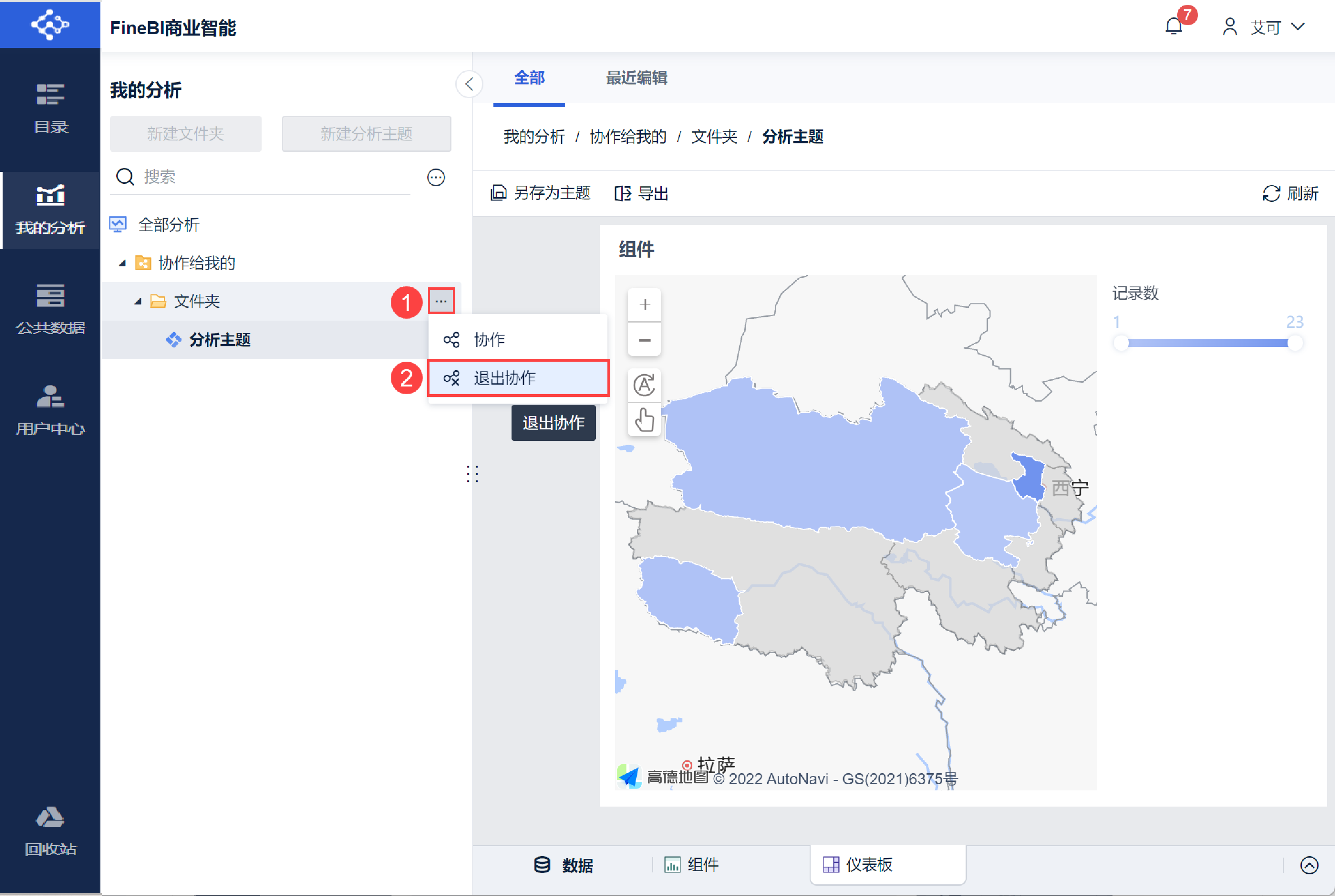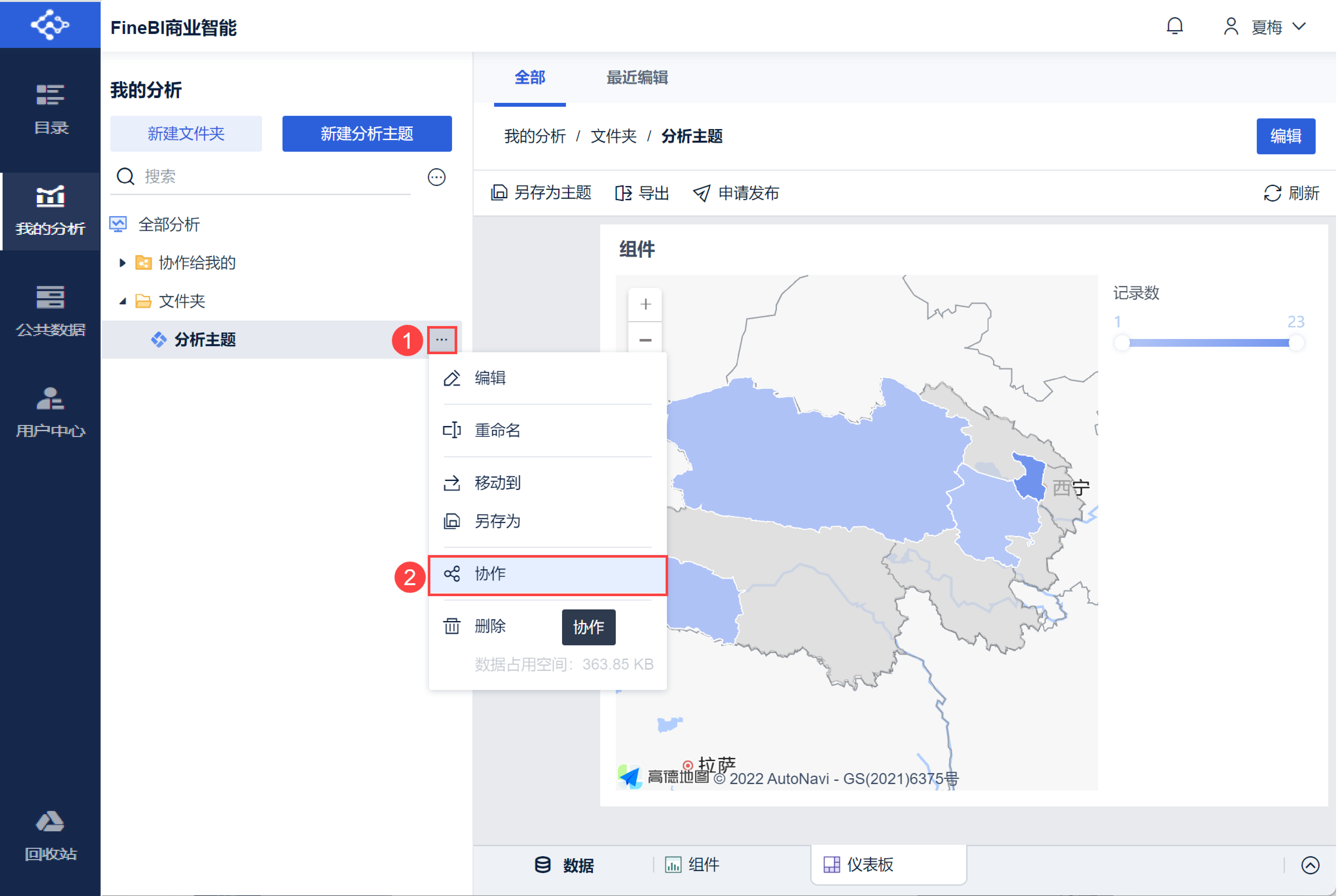 FineBI 支持协作功能,将文件夹或者分析主题协作给其他设计用户。