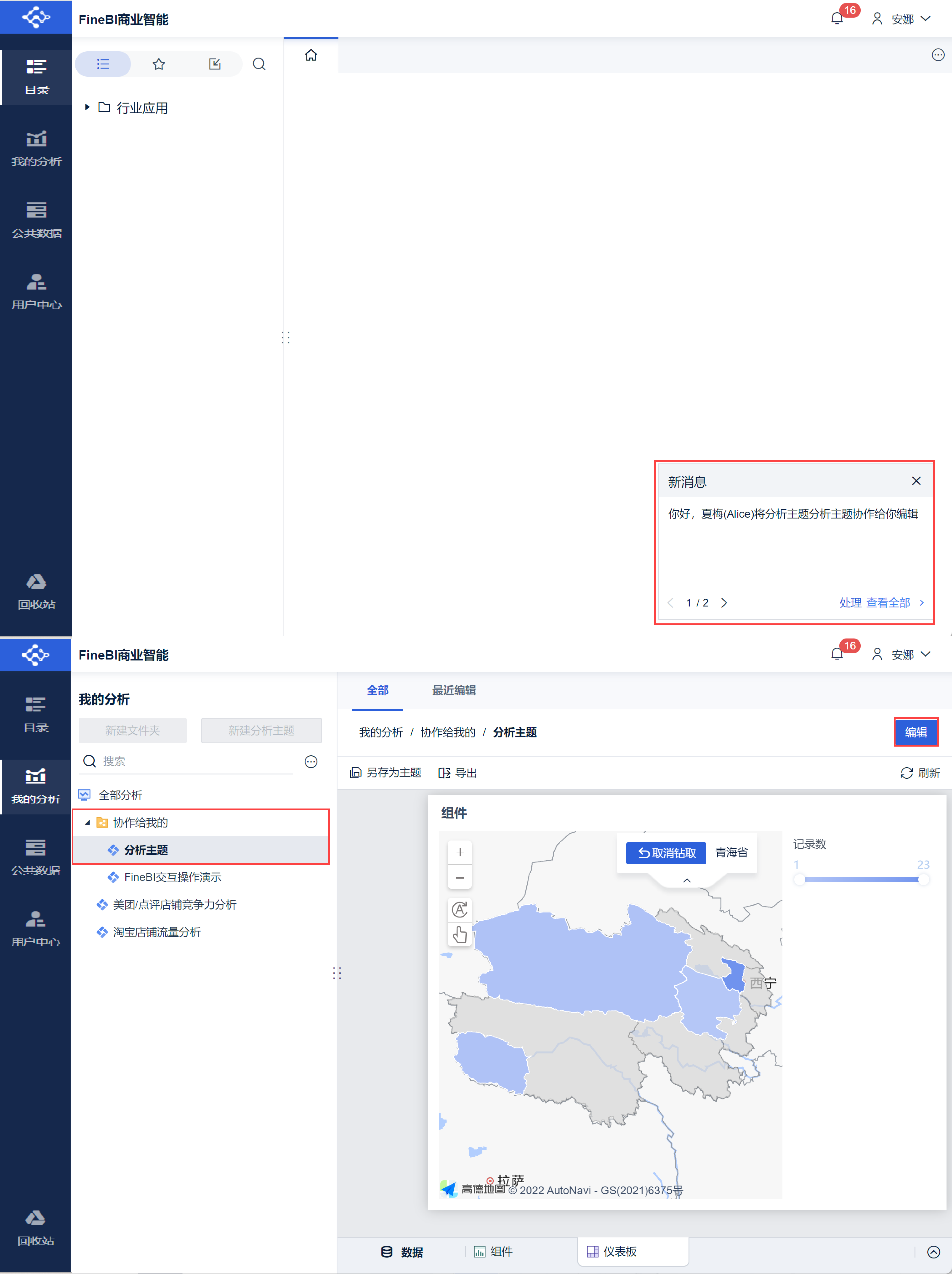 3)Anna 登录账号,可以看到消息提示,同时进入「我的分析>协作给我的」下,同时可以点击右上角的编辑按钮编辑分析主题,如下图所示: