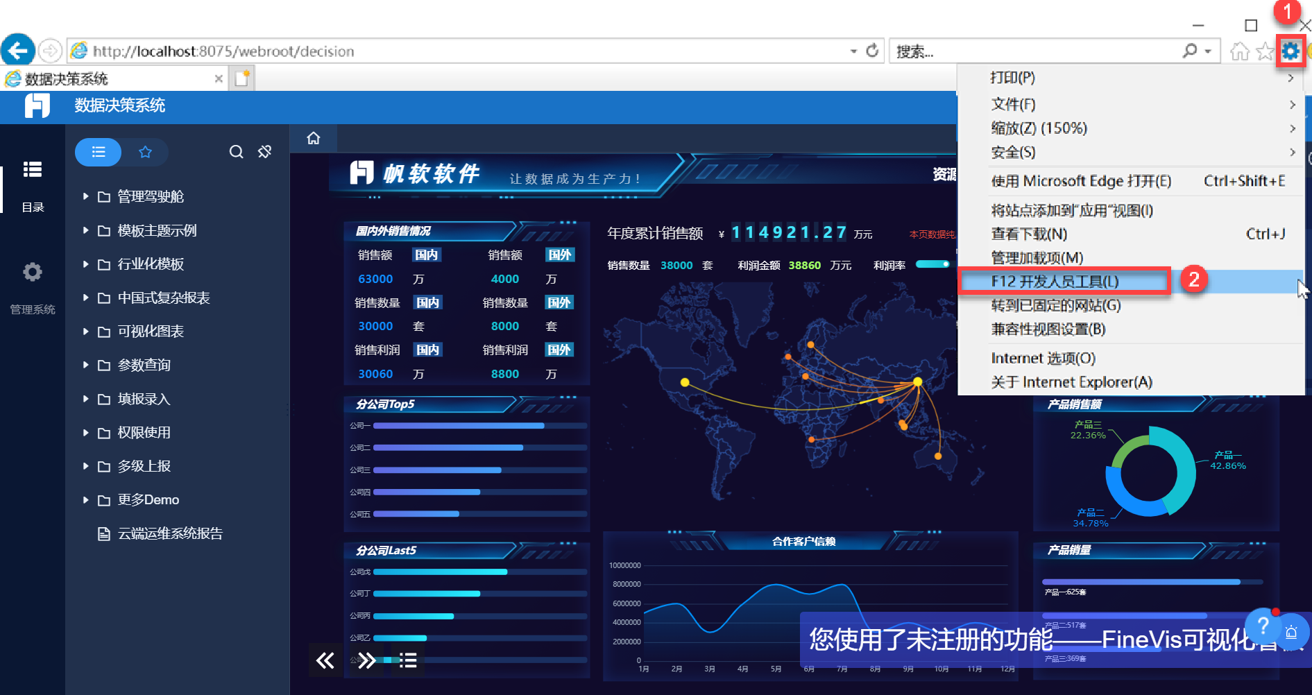 1)IE 浏览器打开数据决策系统页面,点击页面右上角「工具>F12 开发人员工具」,如下图所示: