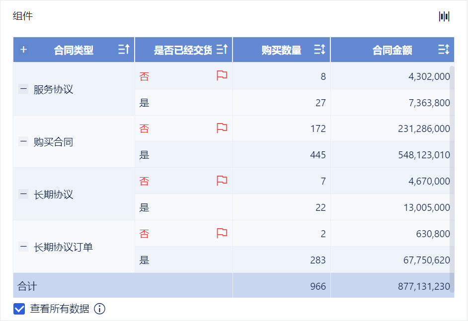 2)创建分组表组件,将左侧待分析区域的「合同类型」拖入维度栏,「购买数量」、「合同金额」拖入指标栏。如下图所示: