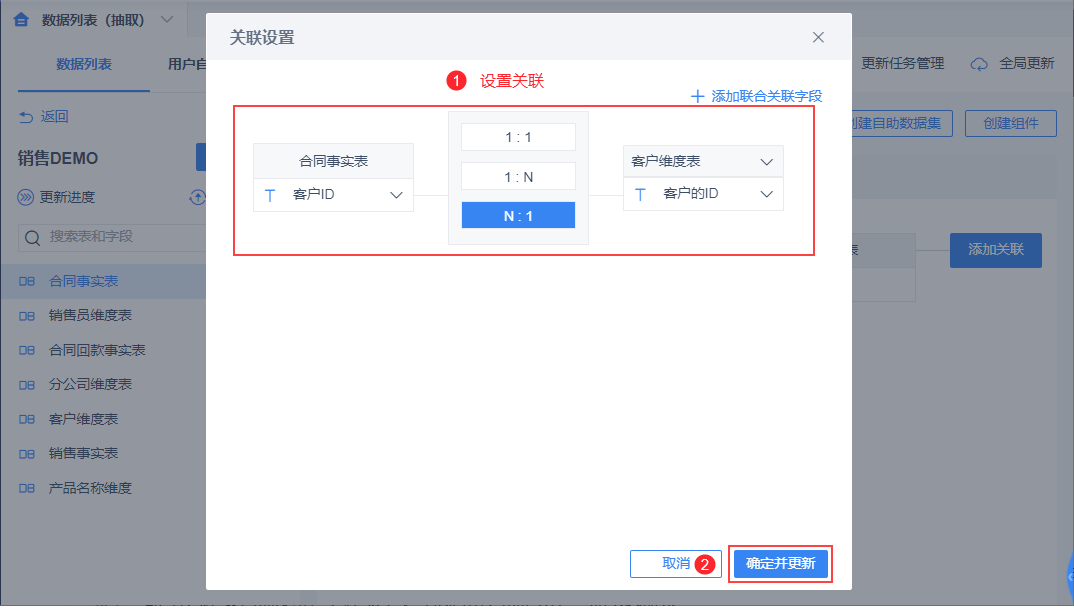 3)根据两张表的关系设置关联,并点击「确定并更新」,如下图所示: