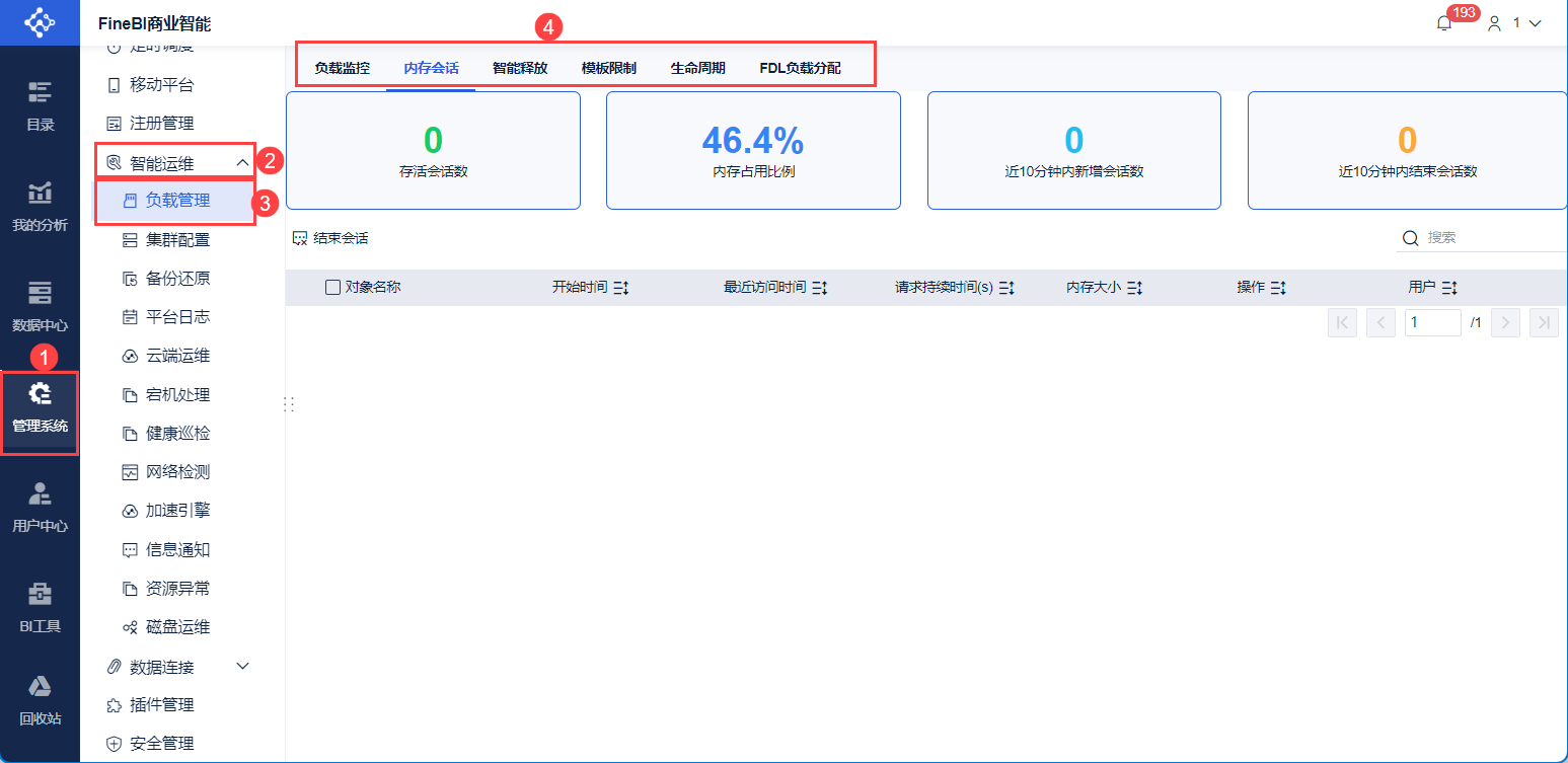 内存会话界面包含存活会话数、内存占用比例、近 10 分钟内新增会话数、近 10 分钟内结束会话数以及结束会话选项。