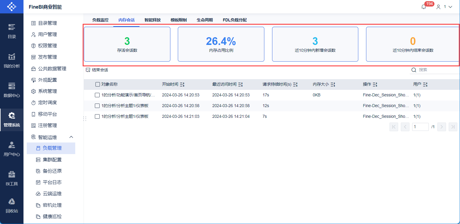 用户在FineBI系统,打开一张目录中的模板,即为一个会话。