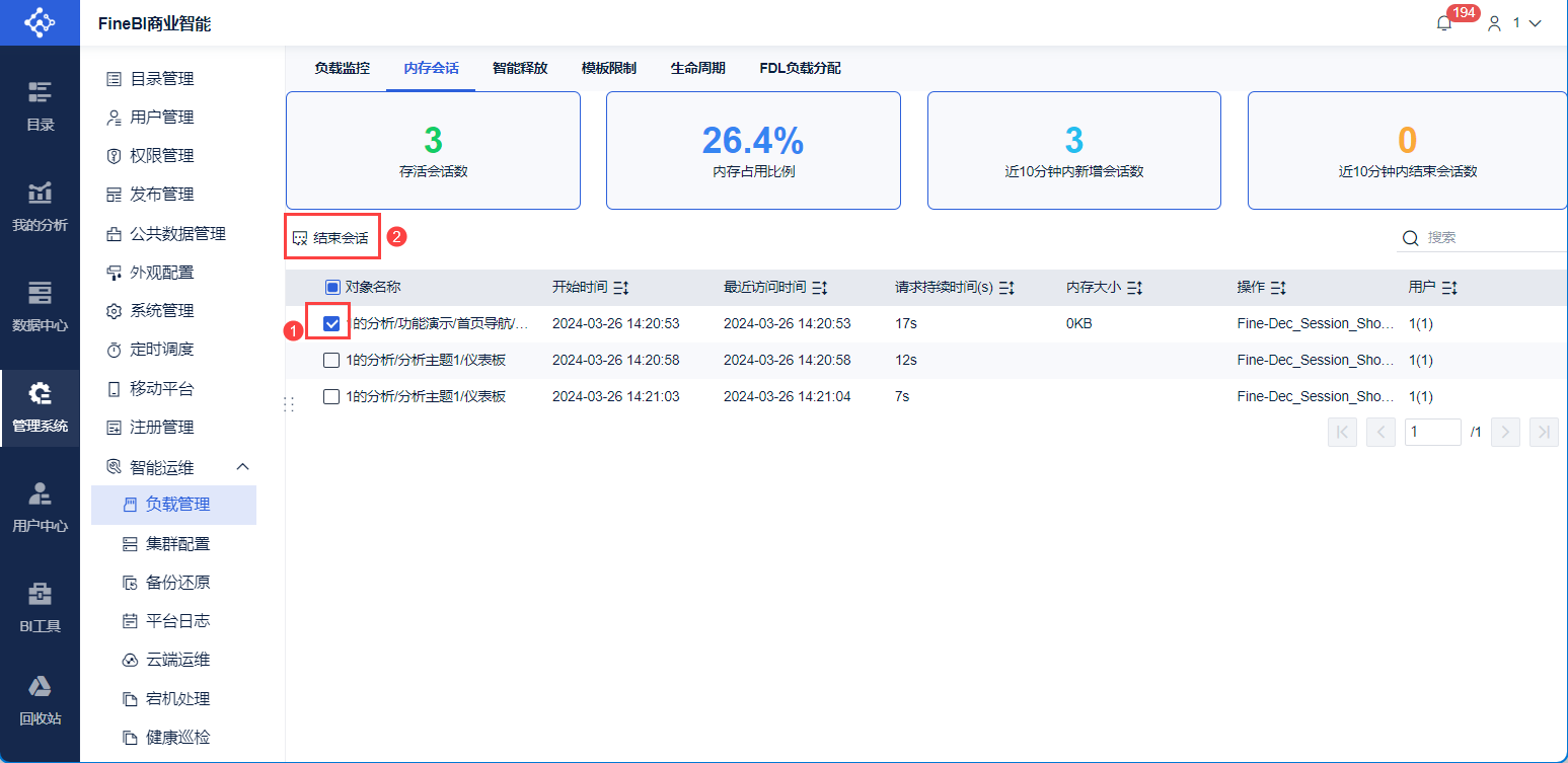 支持选中会话,手动强制杀死 Session 。勾选需要结束的会话,点击「结束会话」即可。如下图所示: