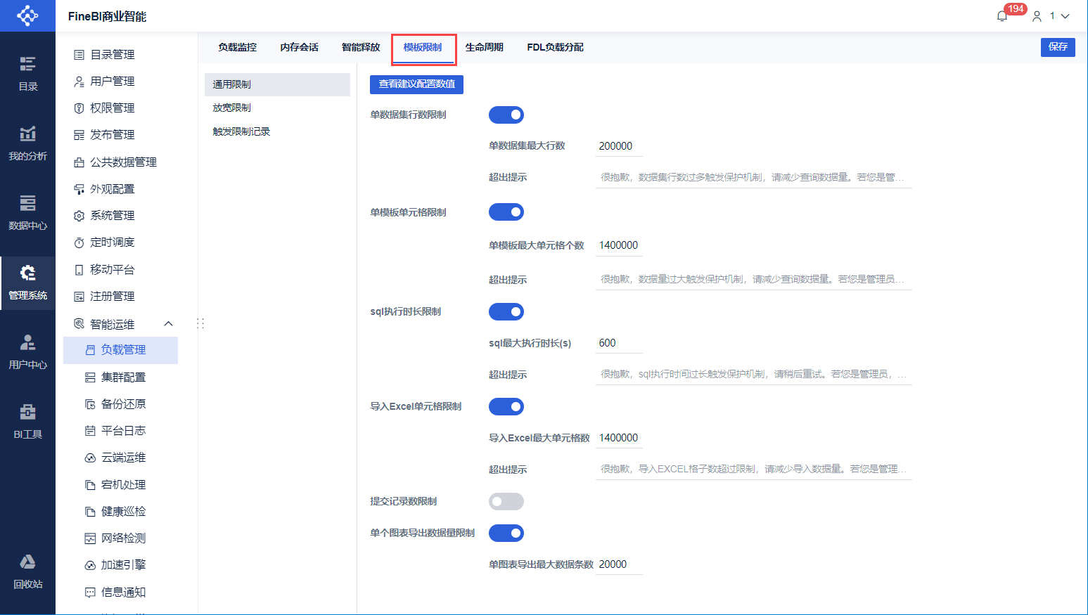 1)可限制单数据集最大行数,可限制一张模板里的最大单元格个数,可限制 SQL 的最大执行时长,可限制导入 Excel 时的最大单元格数,可限制提交的记录数,在限制了提交记录数后还可设置是否允许填报产生笛卡尔积。当达到设置的数量后,拒绝请求,并给出提示。