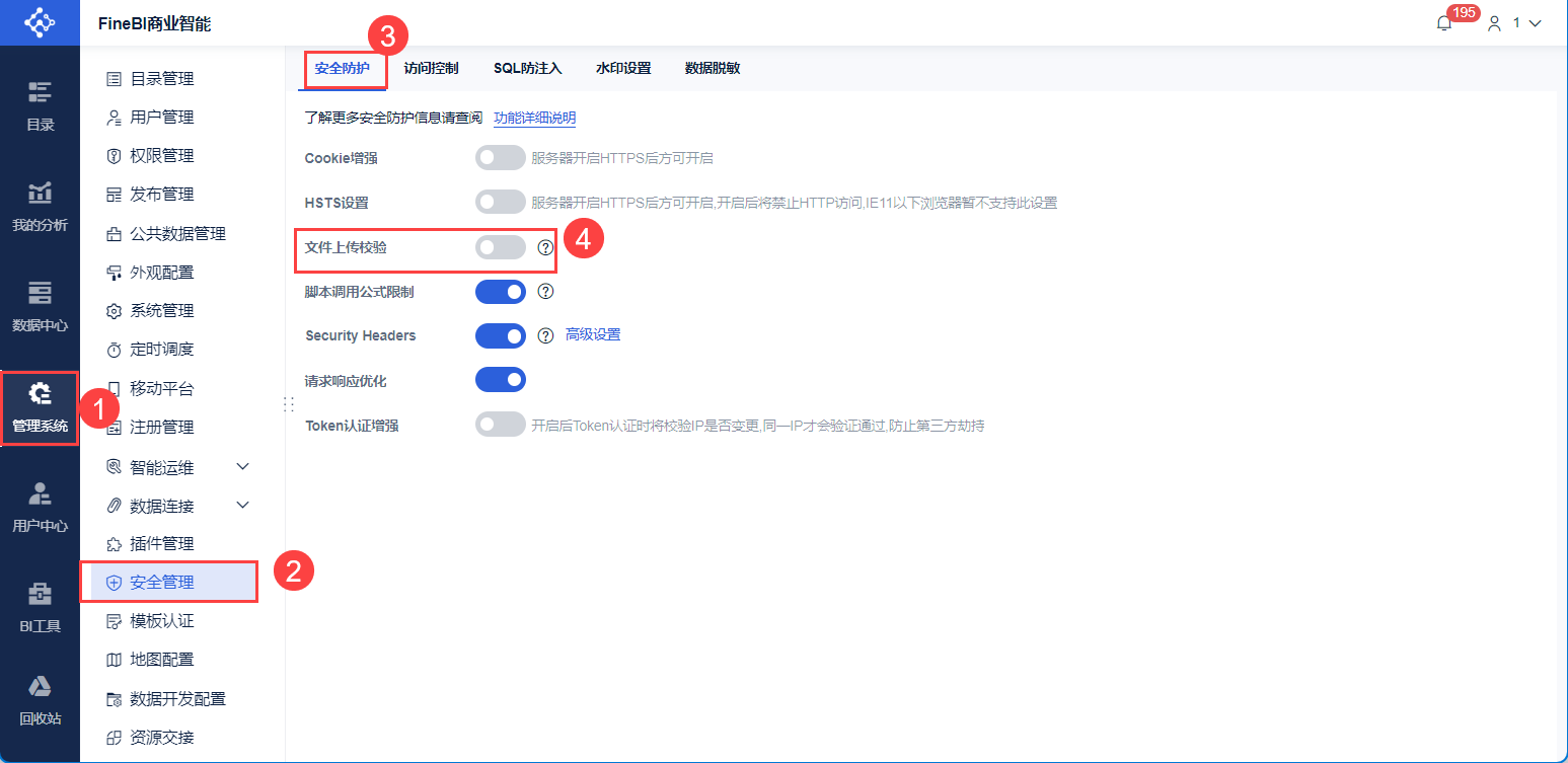 进入管理系统>安全管理,关闭文件上传校验的按钮,如下图所示: