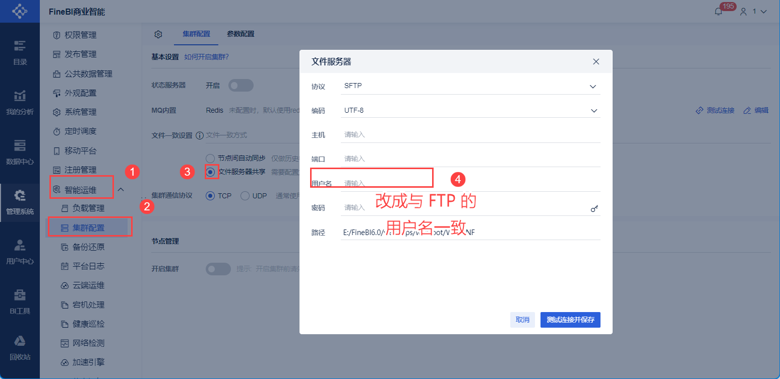 选择管理系统>集群配置,将文件用户名改成与 FTP 的用户名一致,如下图所示: