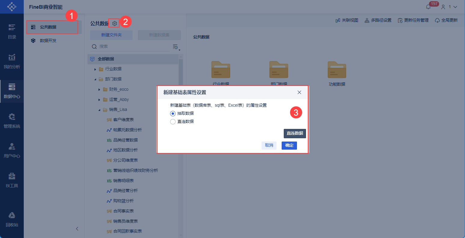 抽取数据: FineBI 将用户数据库中的数据抽取到磁盘中,相当于数据存储到了本地,计算速度会更快,数据需要定期更新;