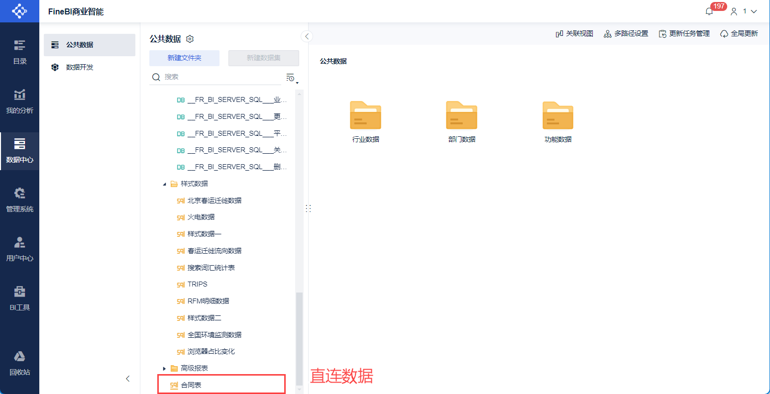 直连数据: 直连数据库请求数据,不需要将数据抽取到 FineBI 磁盘中,所以也无需进行数据更新;