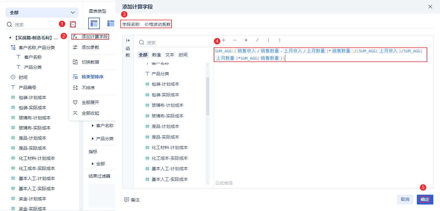 2)将「客户名称」拖入横轴,「销售收入」、「销售成本」、「毛利额」以及「毛利率」拖入纵轴。