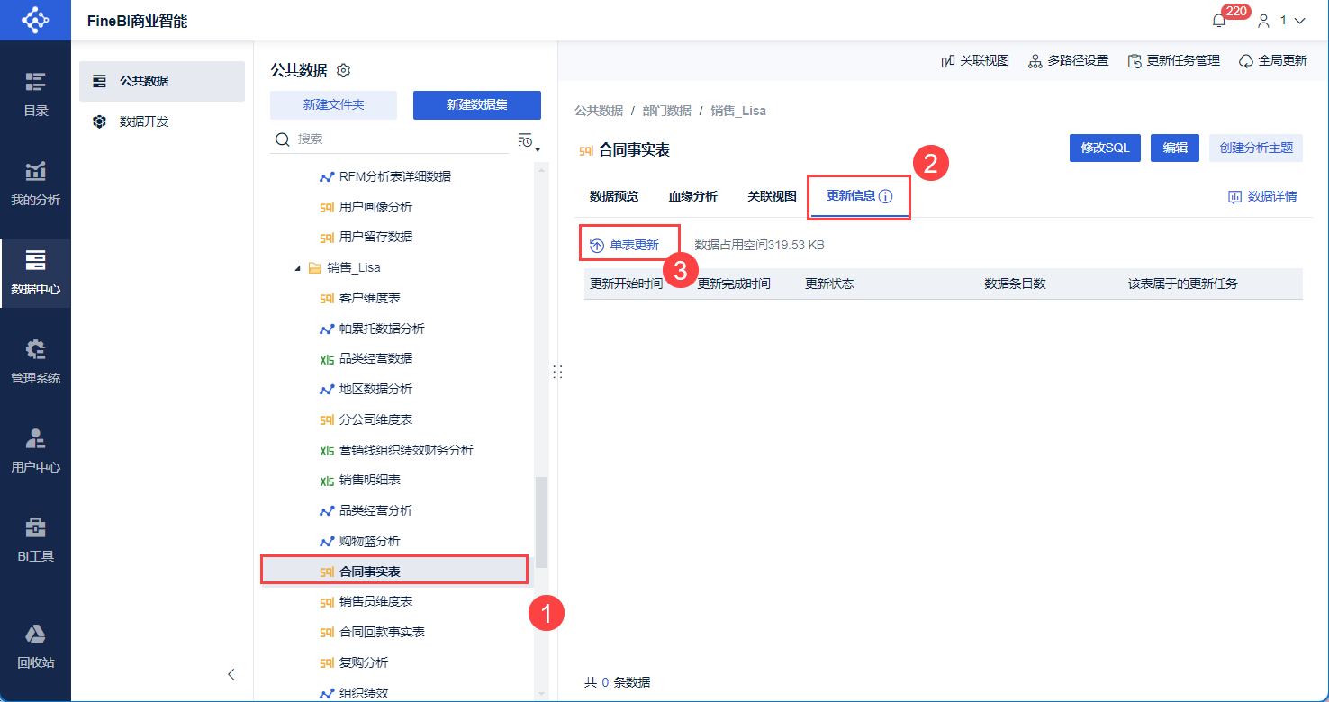 这时候只需要执行一次全量更新,数据库的数据会重新覆盖 FineBI 引擎中的数据,从而保证 FineBI 引擎中的数据和数据库保持一致。