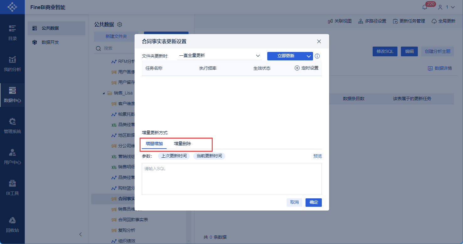 搭配使用「增量增加」和「增量删除」,比如说先删除 FineBI 中一部分数据后,再将数据库中的数据加入到 FineBI 引擎中。