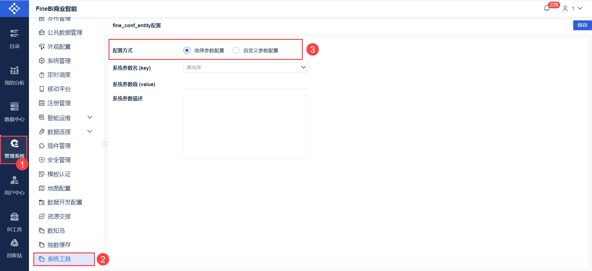 插件安装成功后,超级管理员登录数据决策系统,点击「管理系统」,新增「系统工具」设置。如下图所示: