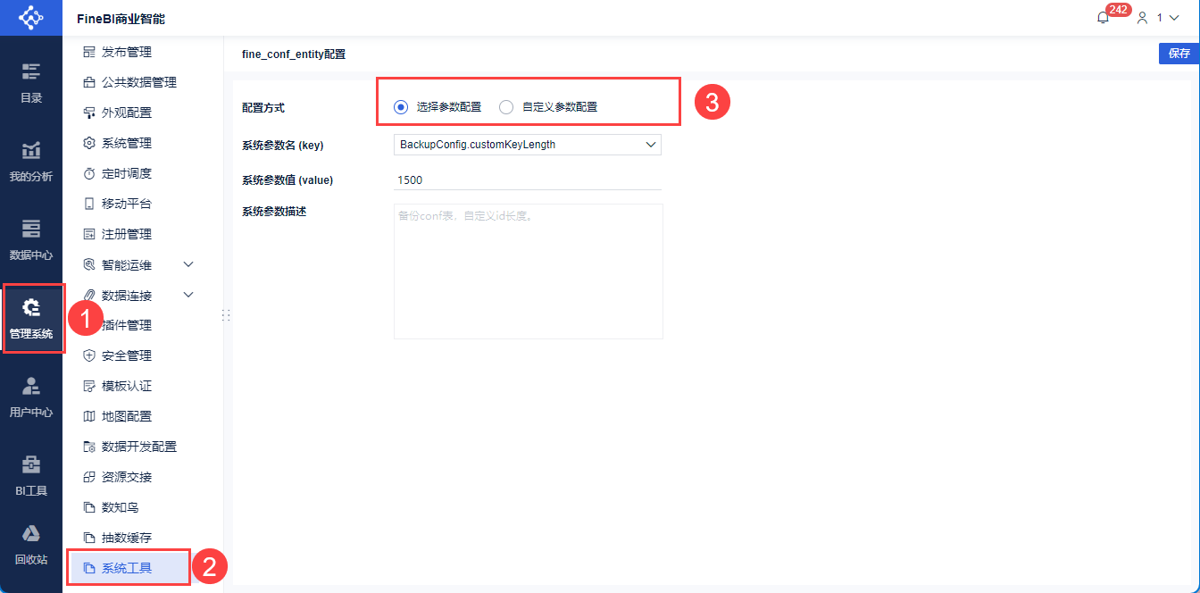 插件安装成功后,超级管理员登录FineBI系统,点击「管理系统」,新增「系统工具」设置。如下图所示: