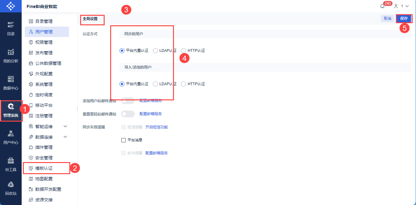 建议:管理员登录FineBI系统,点击「管理系统>用户管理>全局设置」。