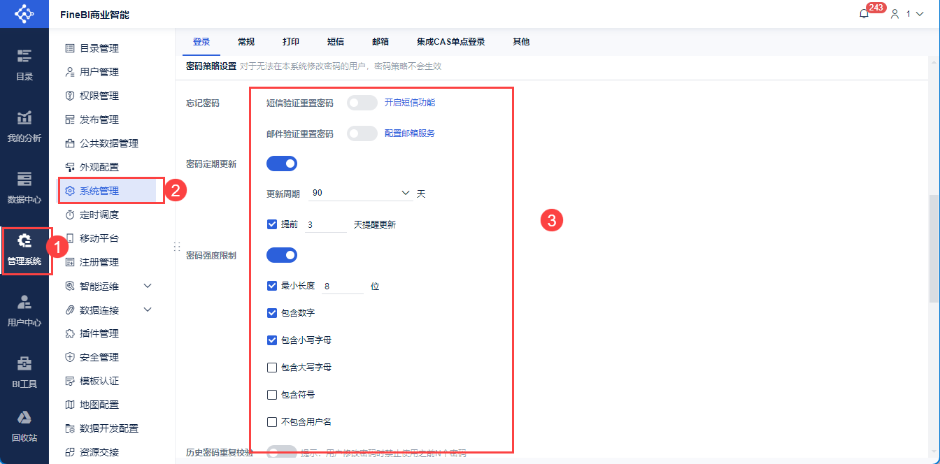 操作:管理员登录FineBI系统,点击「管理系统>系统管理>登录」,在「密码策略设置」处建议勾选以下配置: