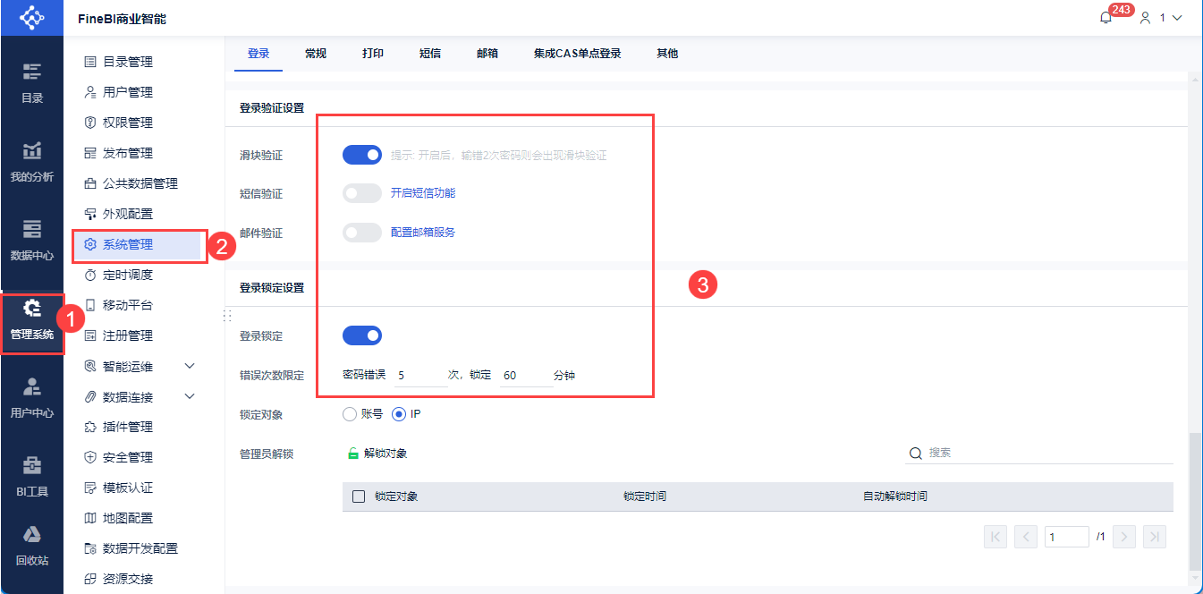 操作:管理员登录FineBI系统,点击「管理系统>系统管理>登录」,开启「登录验证」和「登录锁定>滑块验证」。
