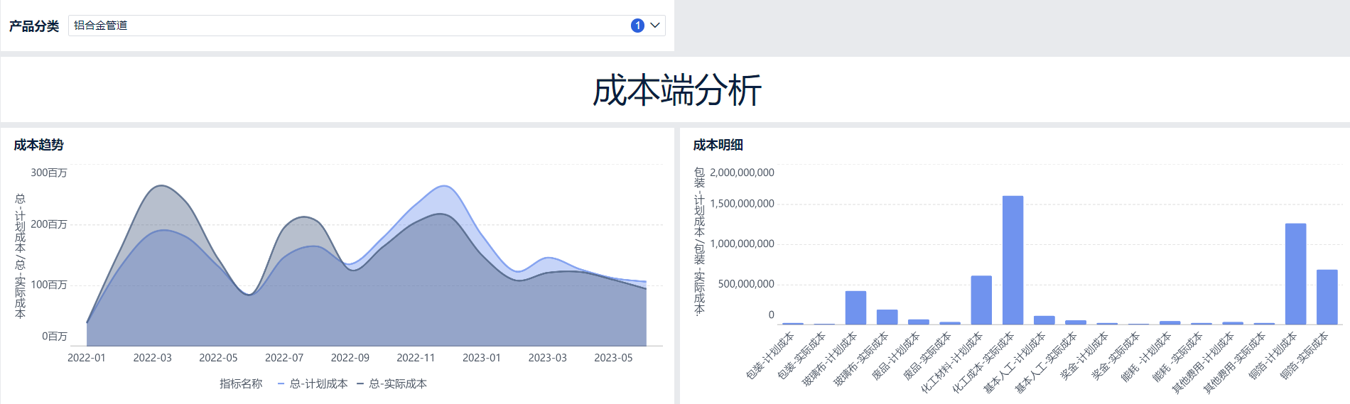 现在我们将深入进行成本明细的分析,识别出可能存在问题的成本项。尽管我们的数据中没有成本类型字段,但我们可以利用FineBI的多指标分析功能。我们可以将利用跨表字段中的指标名称作为分类维度,并利用指标聚合功能,使所有指标都能在同一坐标系内展示。