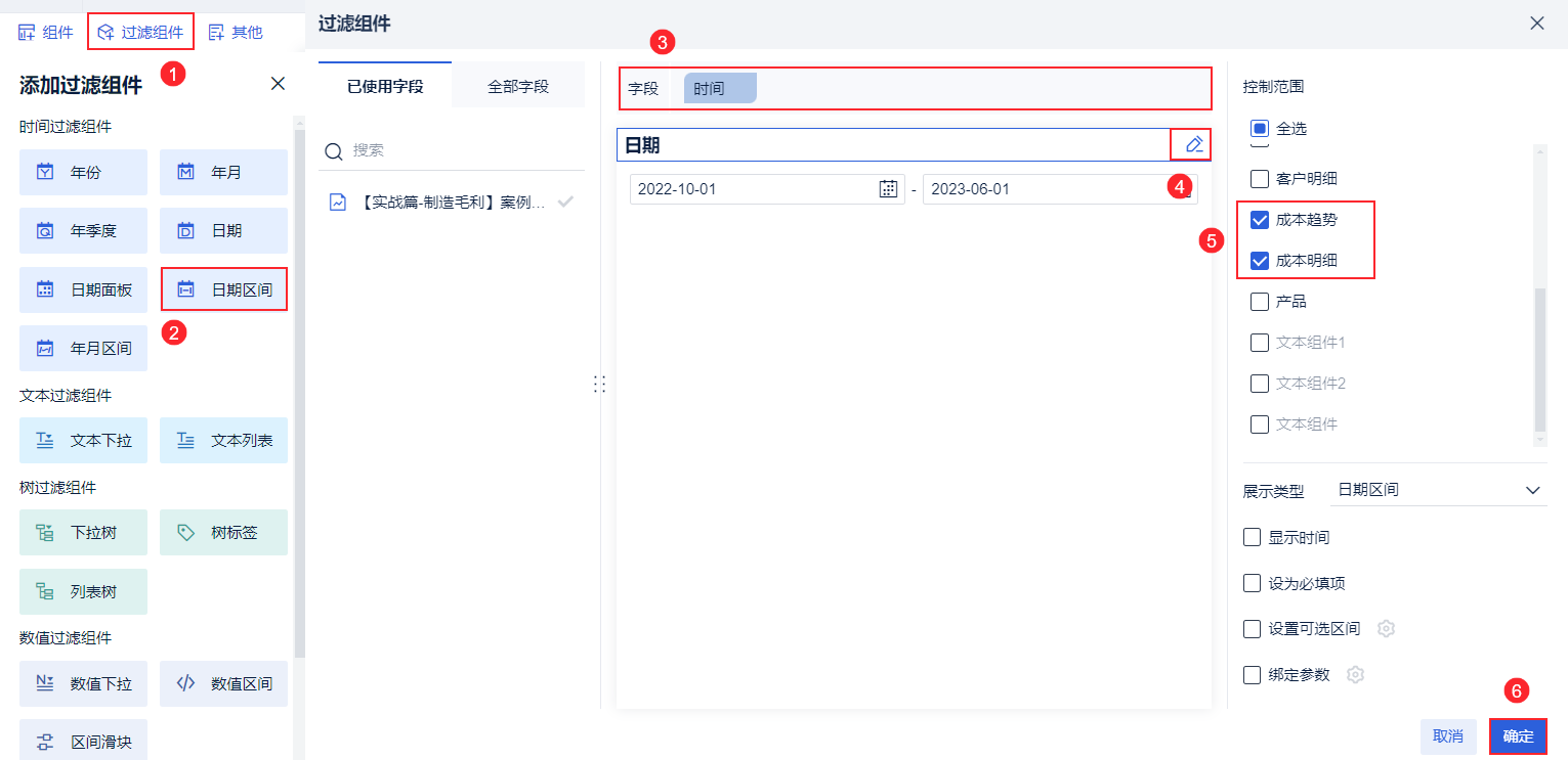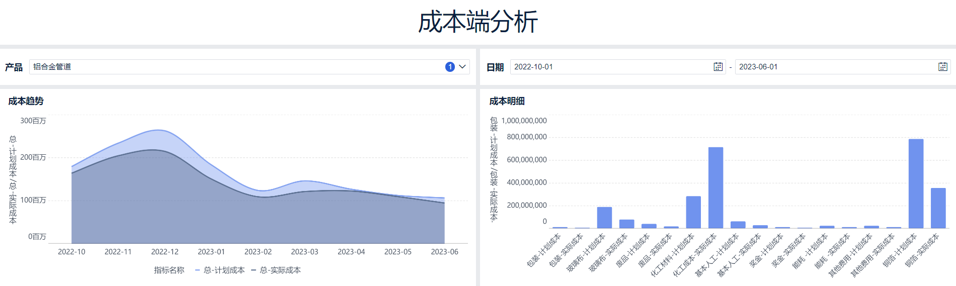 可以发现2022年的实际成本大于计划成本,而2023年的计划成本小于实际成本,我们可以进一步通过过滤日期来找出前后的原因。这里,我们使用「日期区间」过滤组件进行切片分析,如下图所示: