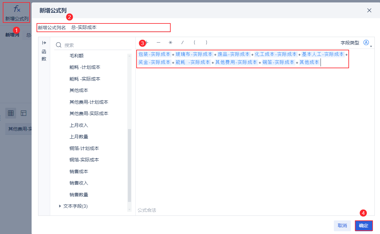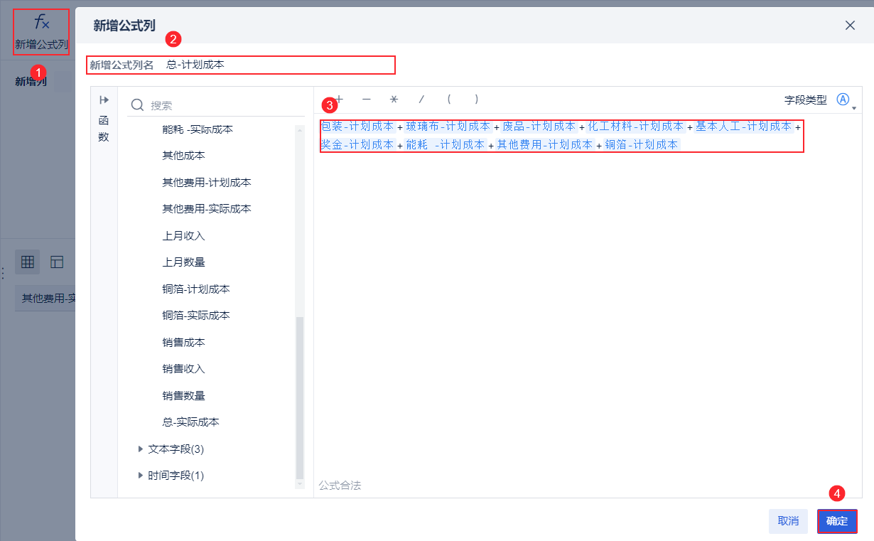 可以在数据集里添加公式列,也可以在组件里新建计算字段。这里我们在数据集里添加公式列,如下图所示: