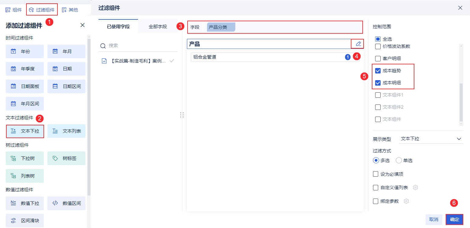 我们可以使用「文本下拉」过滤组件,对「产品分类」做一个过滤,并利用帕累托分析找到销售额贡献较大的产品,通过过滤对其分析。如下图所示: