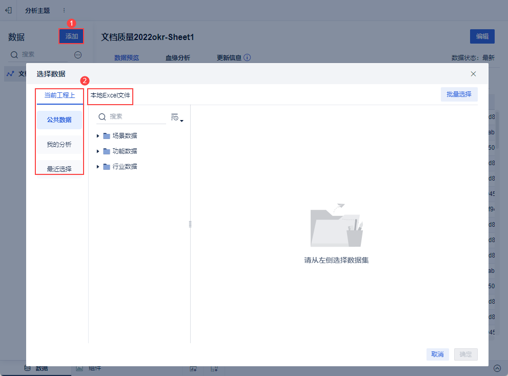 在主题编辑界面,设计用户可以在主题中添加数据,数据来源可以是当前工程/本地Excel文件。支持批量选择。
