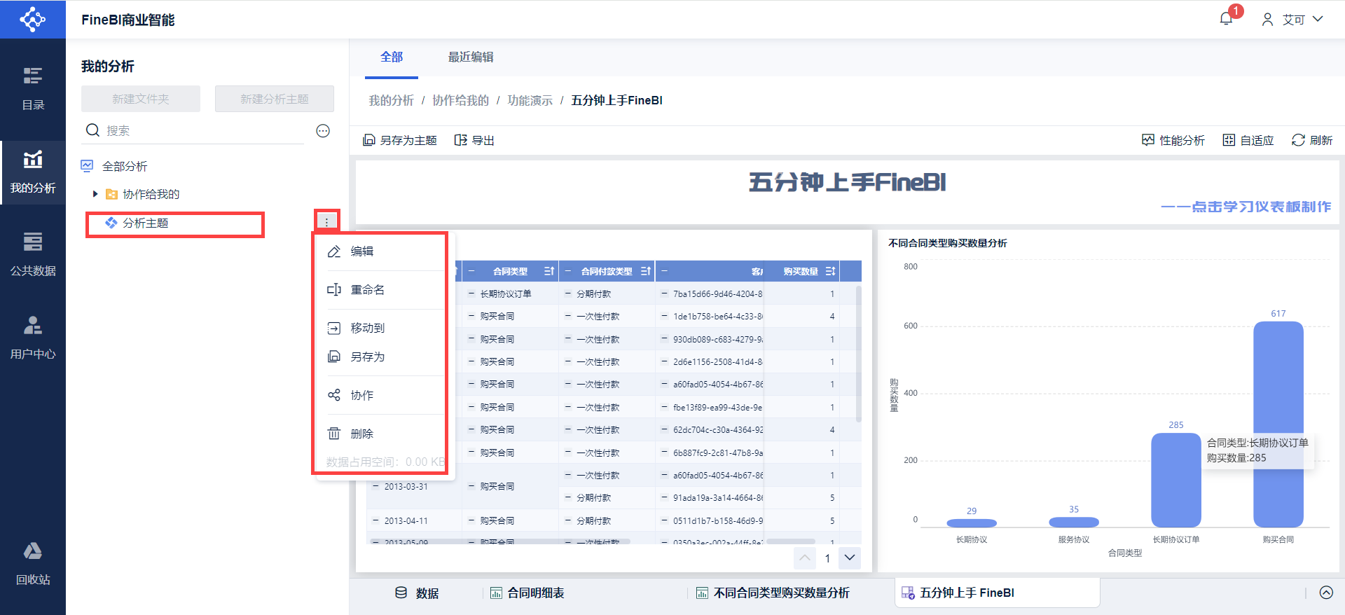 可对我自己创建的主题进行编辑、重命名、移动、另存、删除、协作给他人等操作。