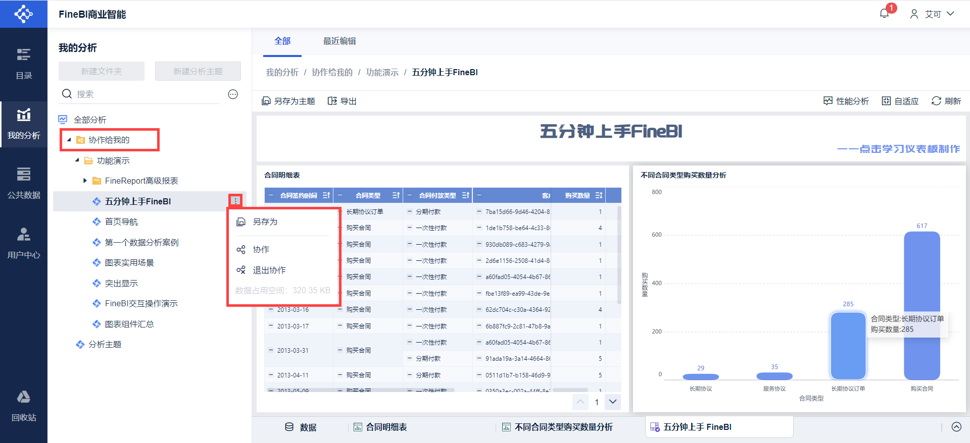 根据对方给予的权限,可对主题进行编辑、重命名、另存、协作、退出协作。如下图所示: