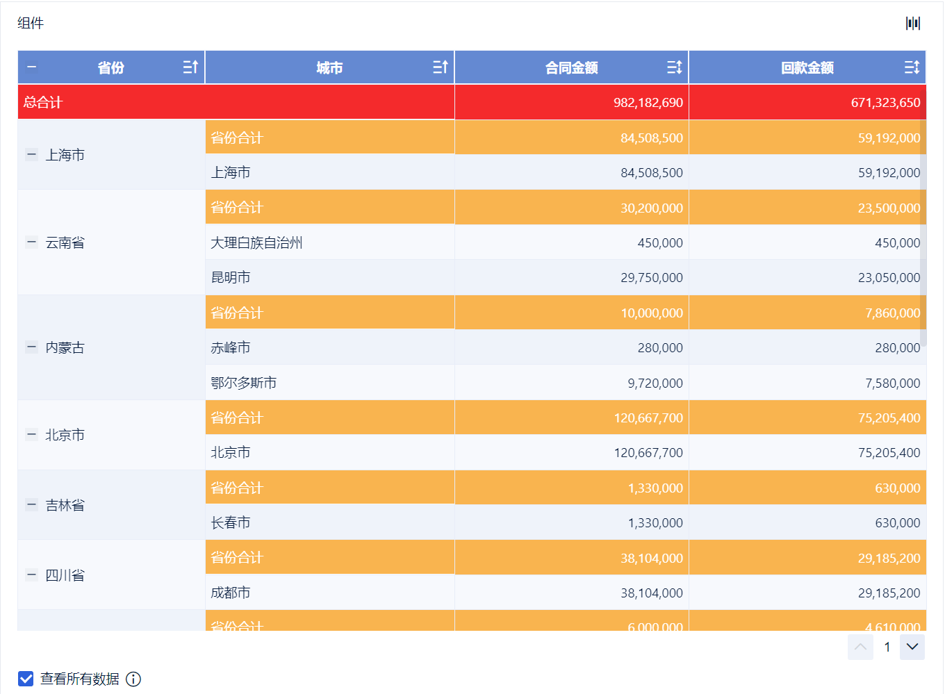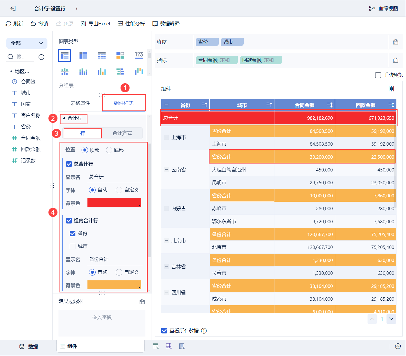 设置合计行的显示位置为顶部,总合计行的显示名为「总合计」且背景色为红色,省份组内合计行的显示名为「省份合计」且背景色为橙色。