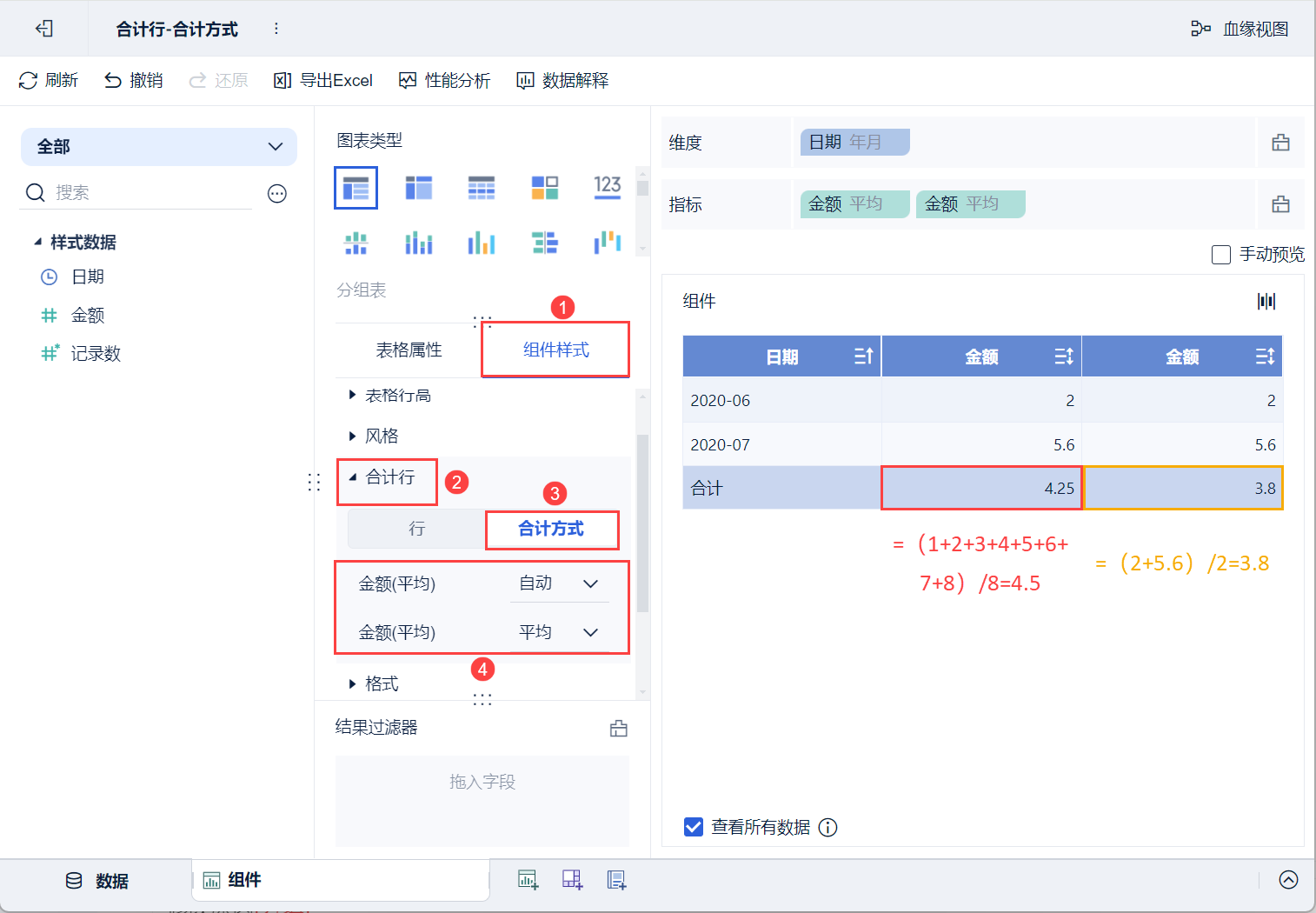 1)点击「组件样式> 合计行>合计方式」,用户可选择对应指标的合计方式。