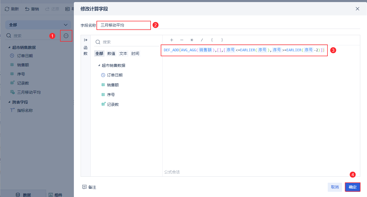 | DEF_ADD(AVG_AGG(销售额), [],[序号<=EARLIER(序号),序号>=EARLIER(序号-2)]) | 根据过滤条件,过滤前三个月的销售额并求平均 | DEF_ADD |