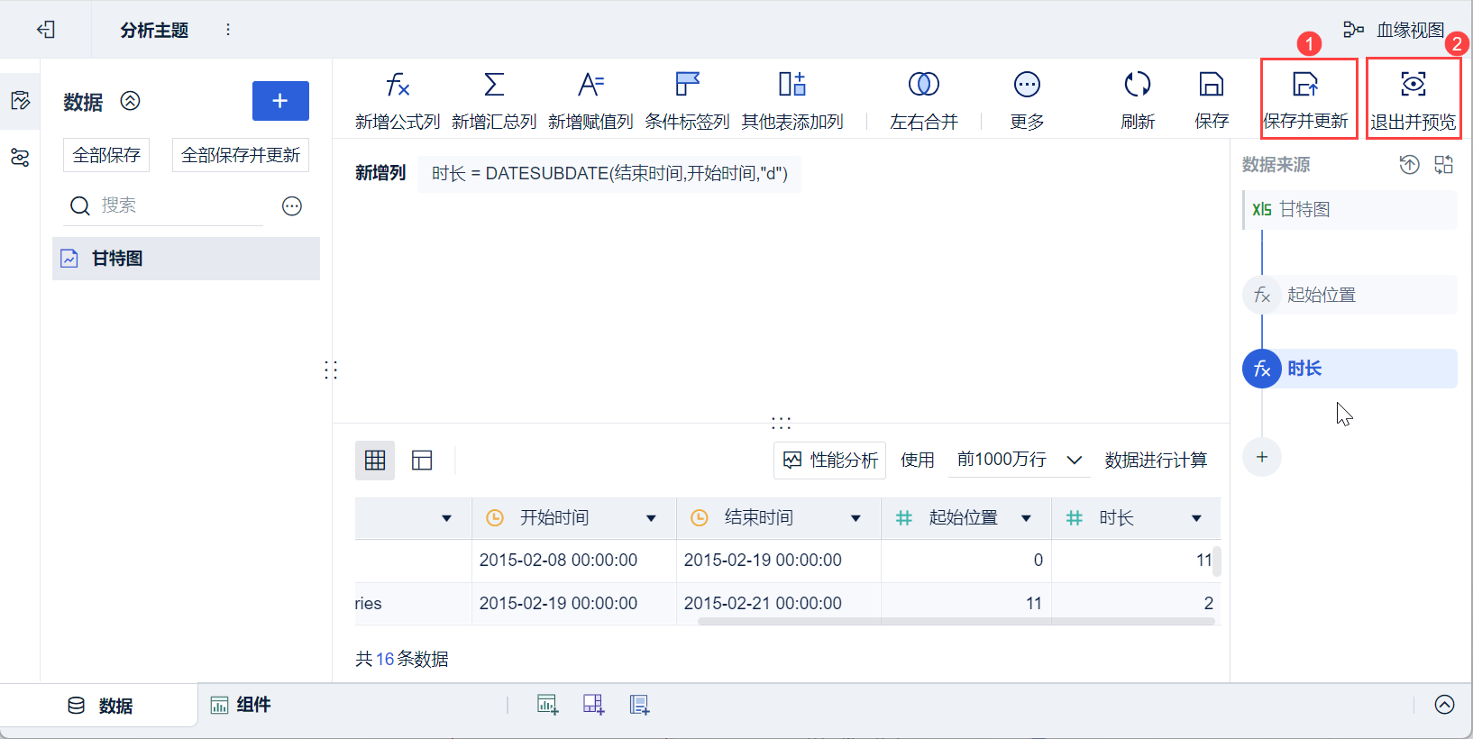 5)在弹出的新增公式列设置框中输入新增公式列名为「时长」,输入公式:DATESUBDATE(结束时间,开始时间,"d")