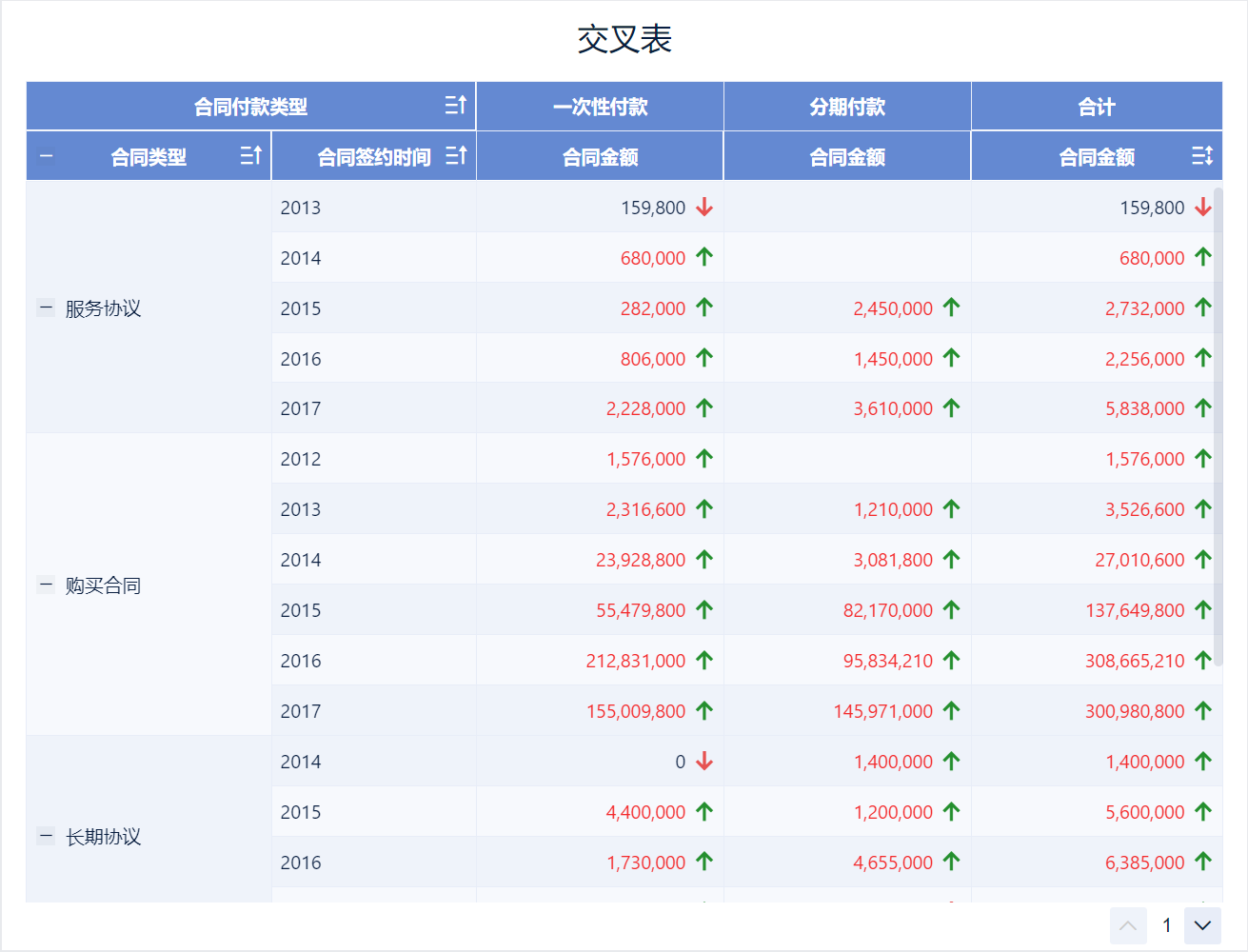 • 可制作行、列都有分组的表格,支持对指标的汇总和其他计算。
