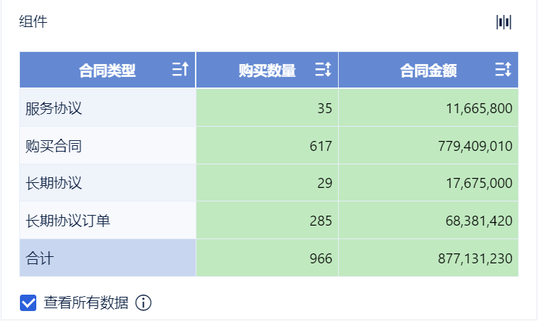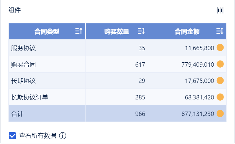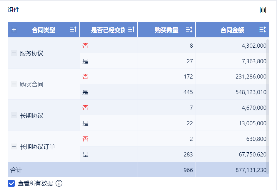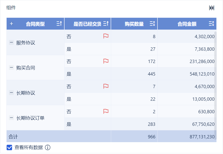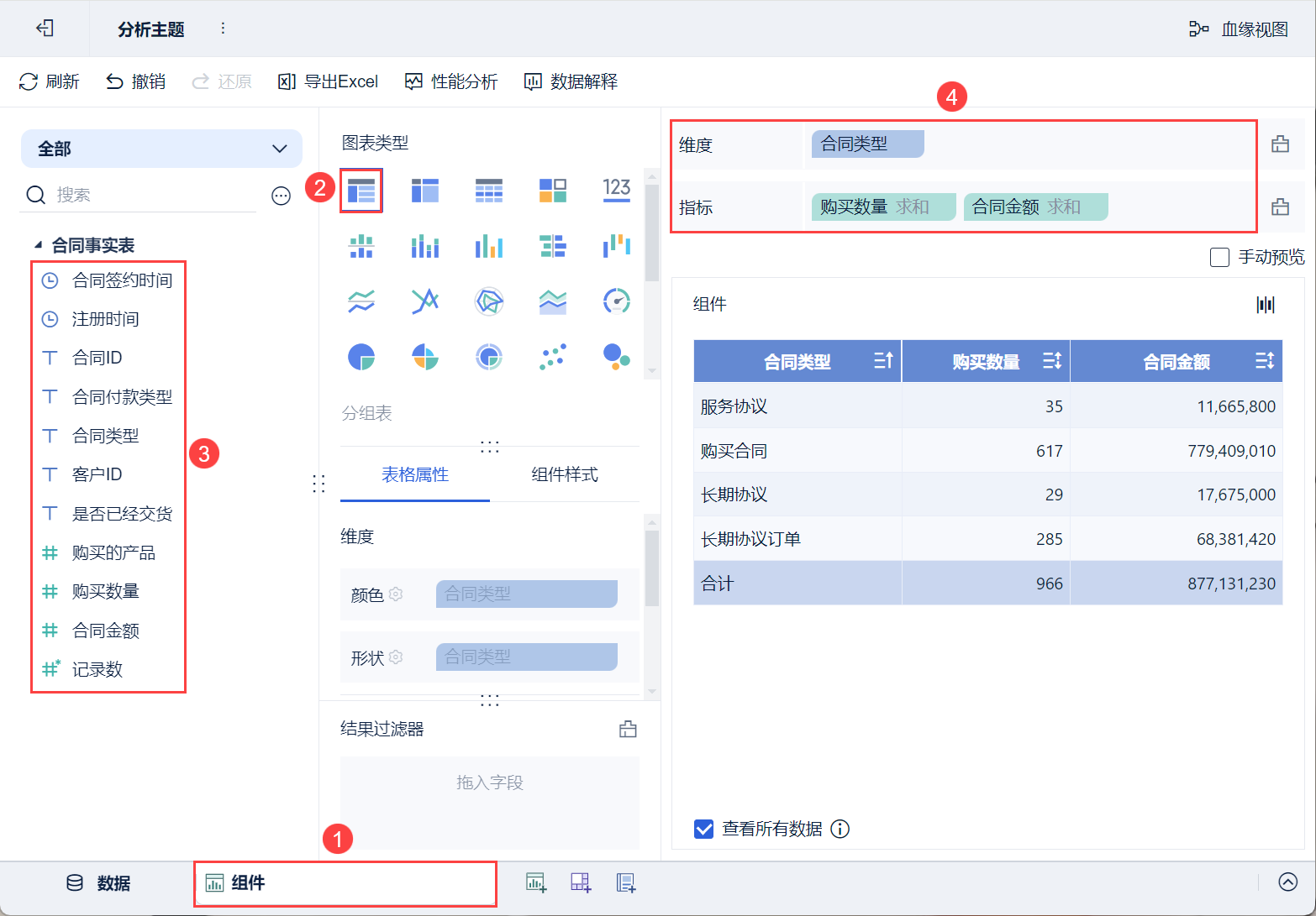 2)创建分组表组件,将左侧待分析区域的「合同类型」拖入维度栏,「购买数量」「合同金额」拖入指标栏。如下图所示: