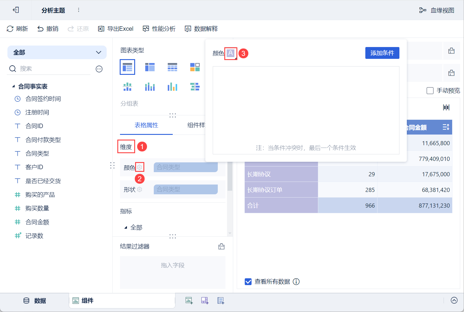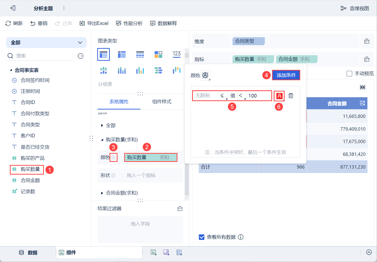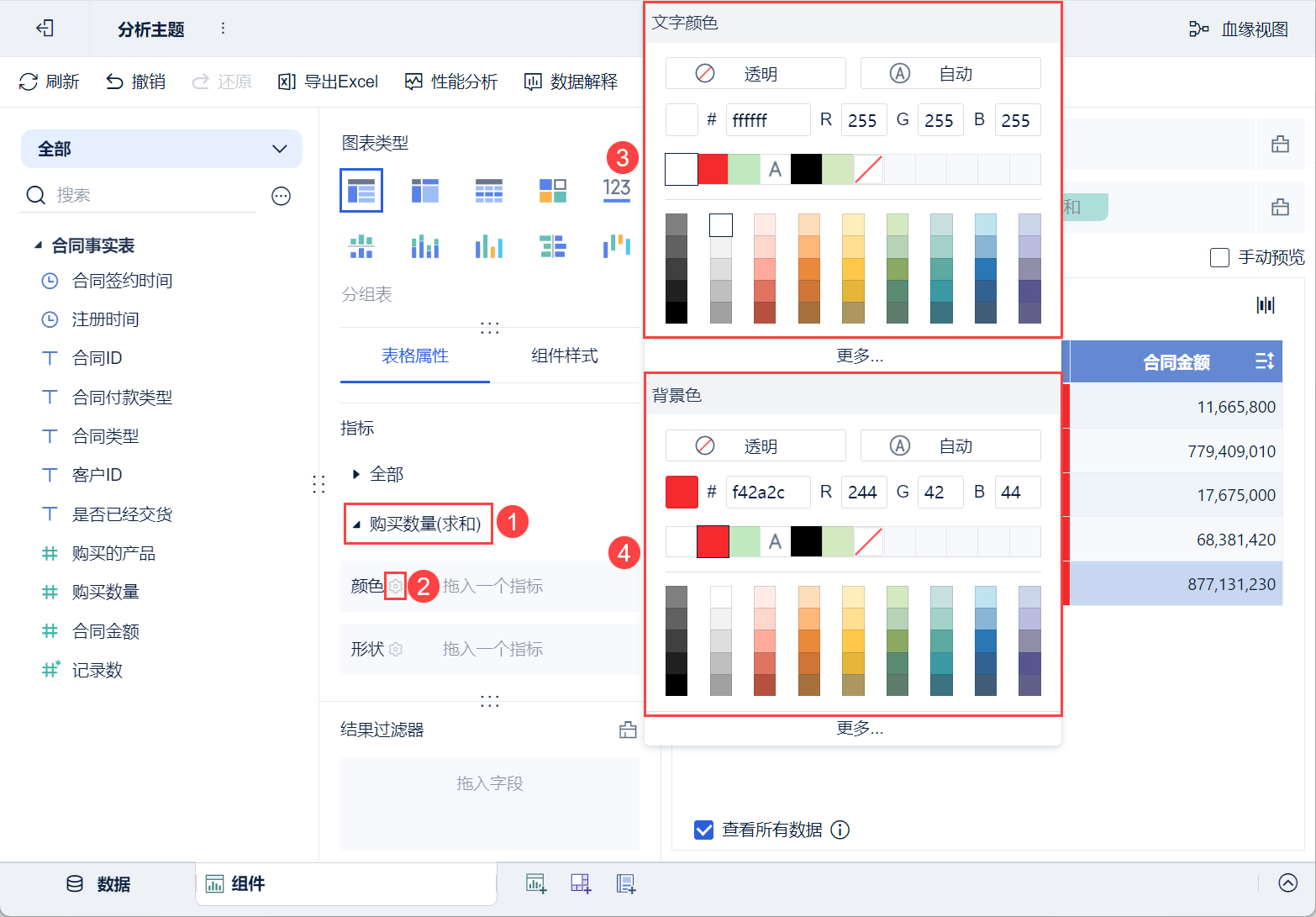 • 将左侧待分析区域的「合同金额」拖入「表格属性>指标>购买数量」中的「颜色」栏。