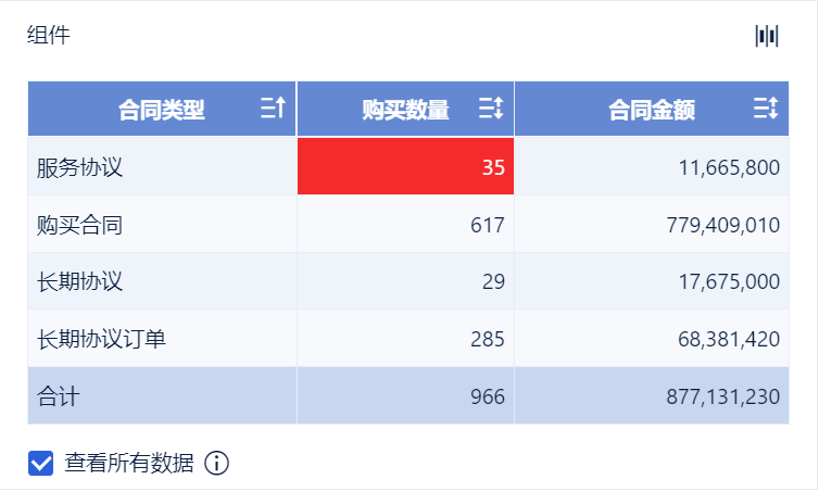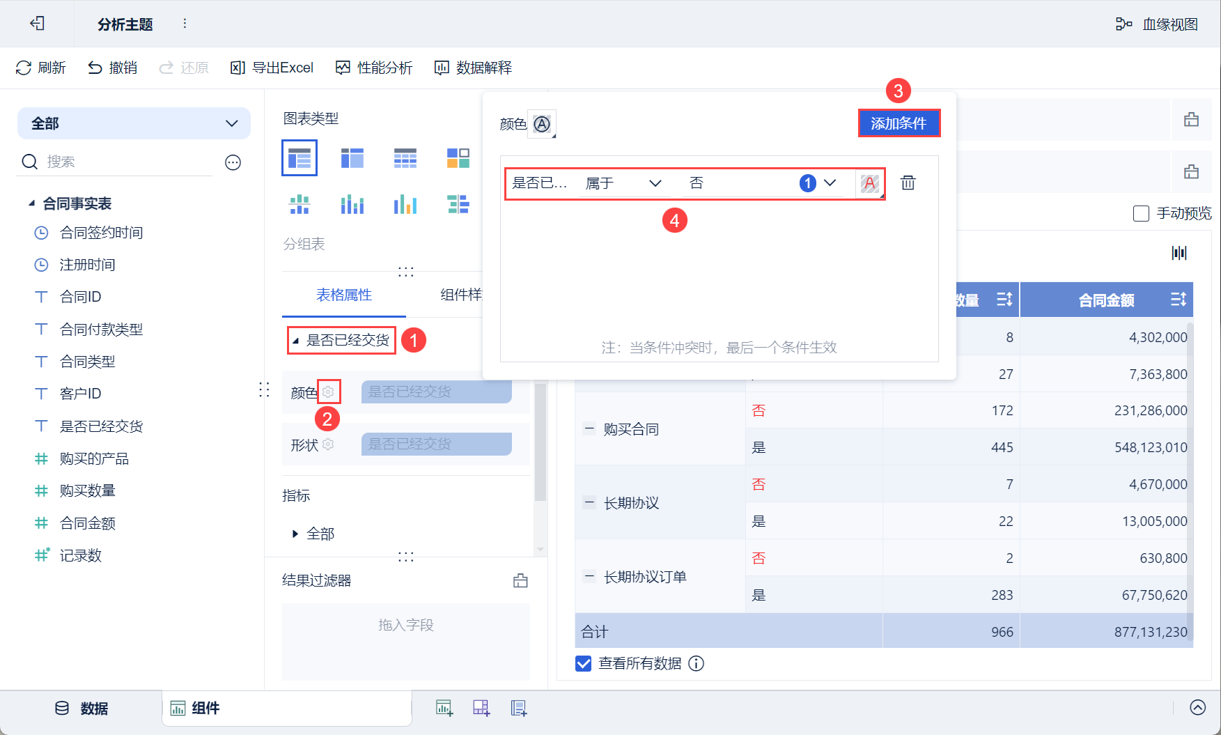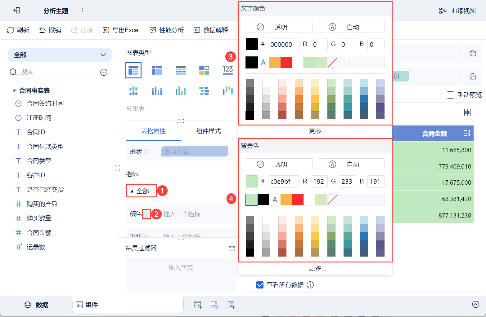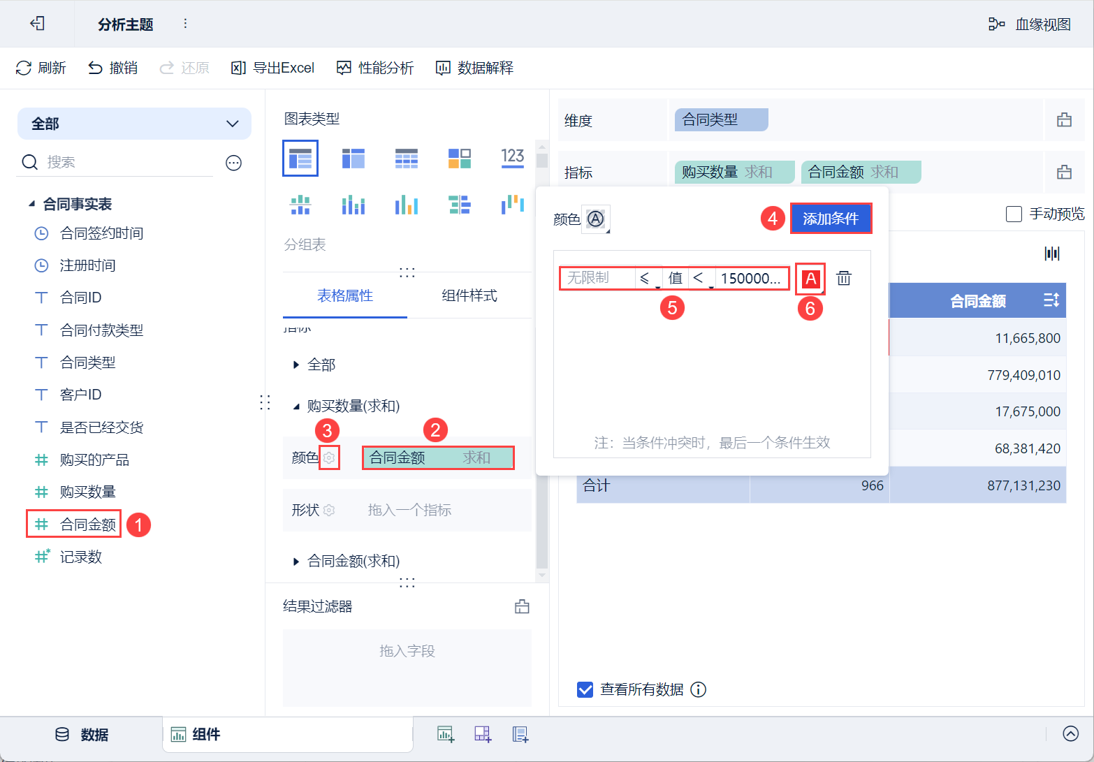• 将左侧待分析区域的「合同金额」拖入「表格属性>指标>购买数量」中的「颜色」栏。
