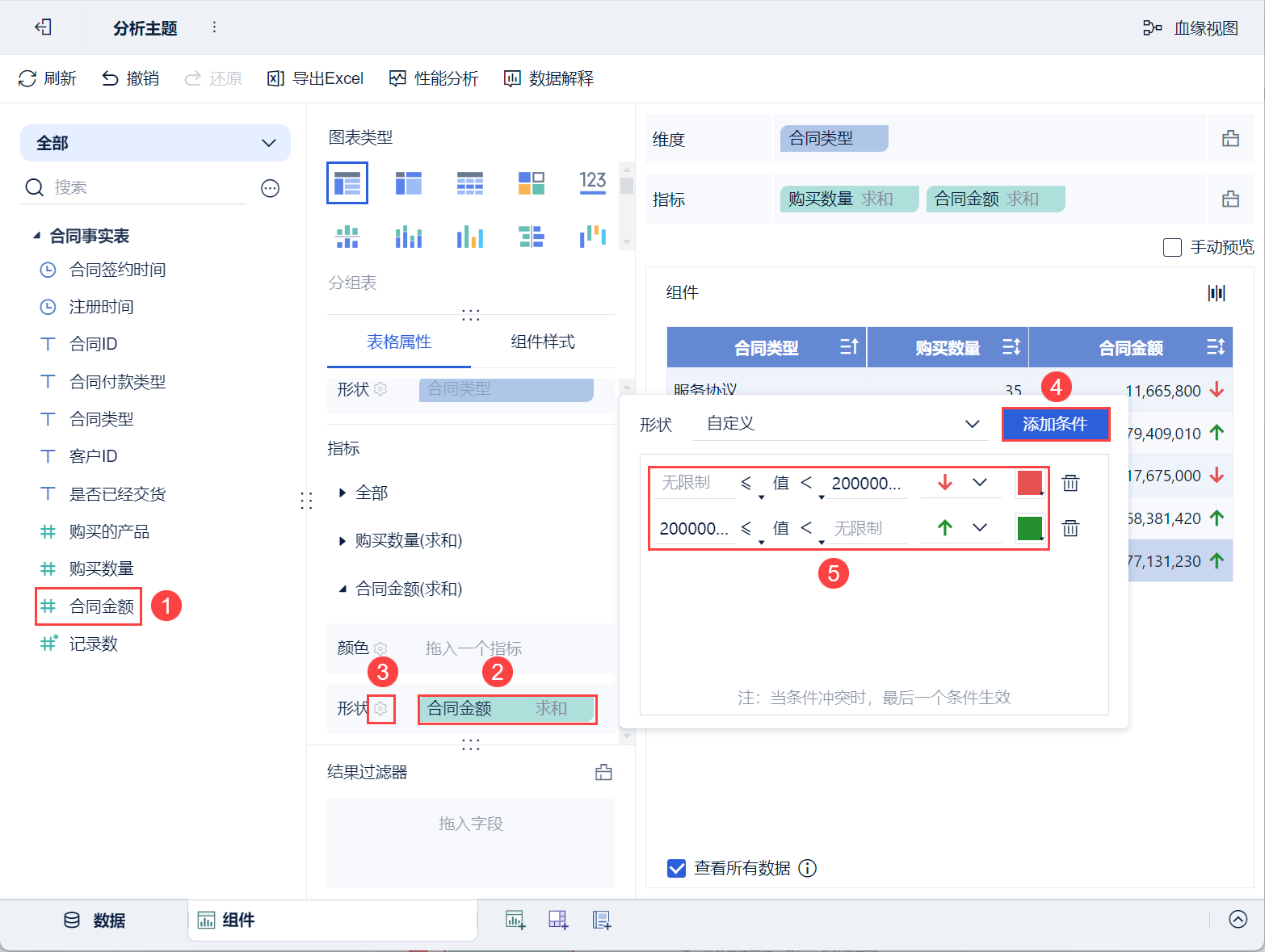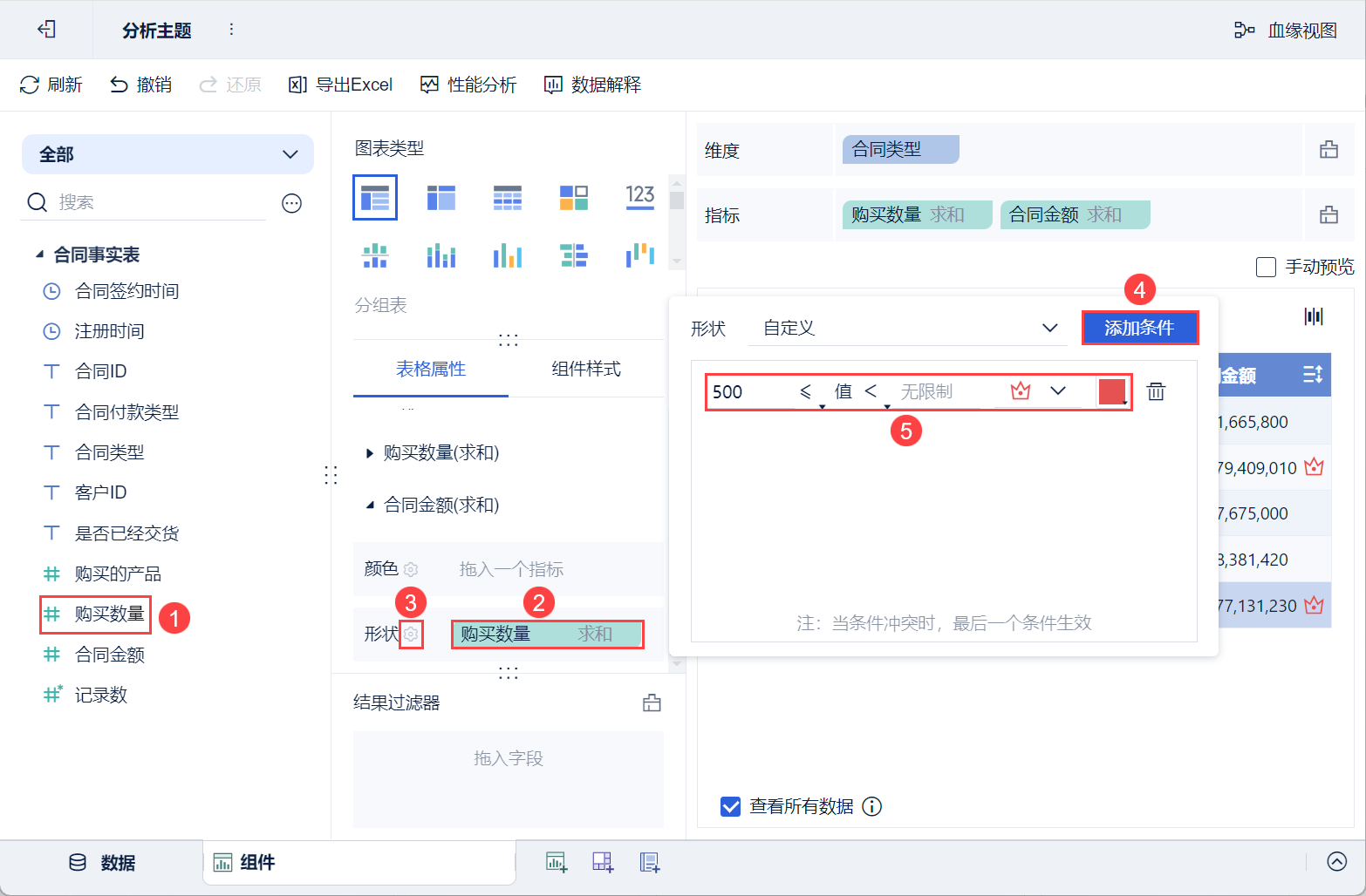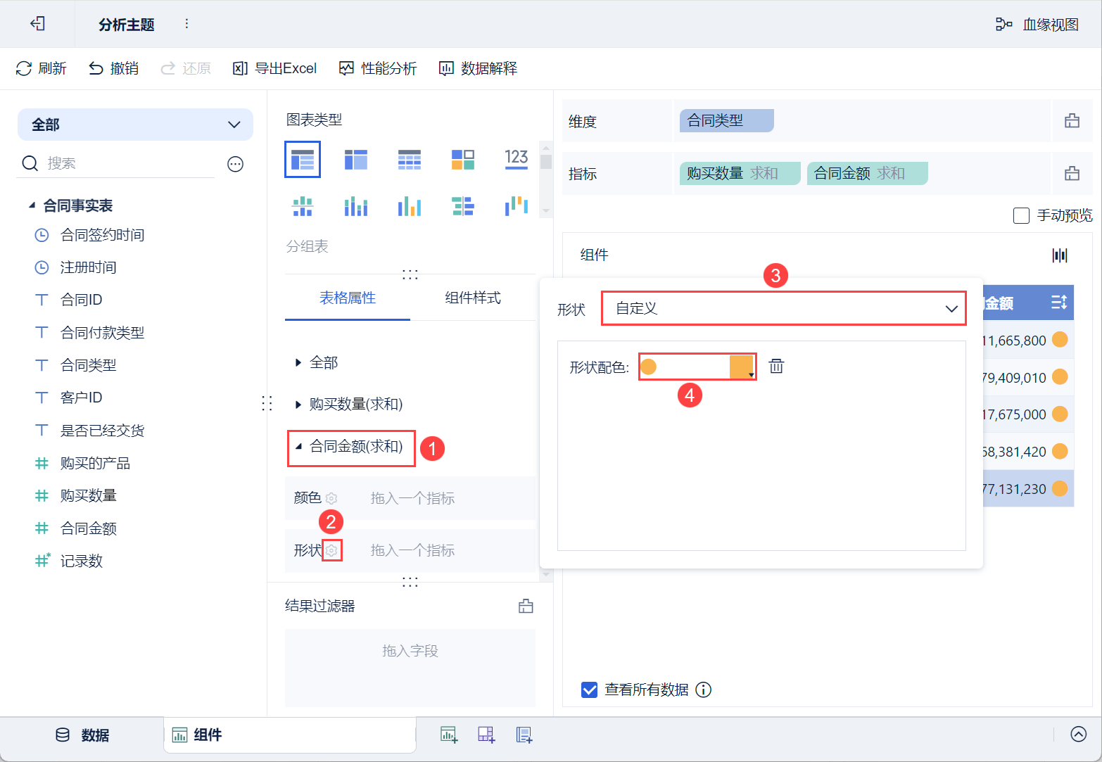 • 将左侧待分析区域的「购买数量」拖入「表格属性>指标>合同金额」中的「形状」栏。