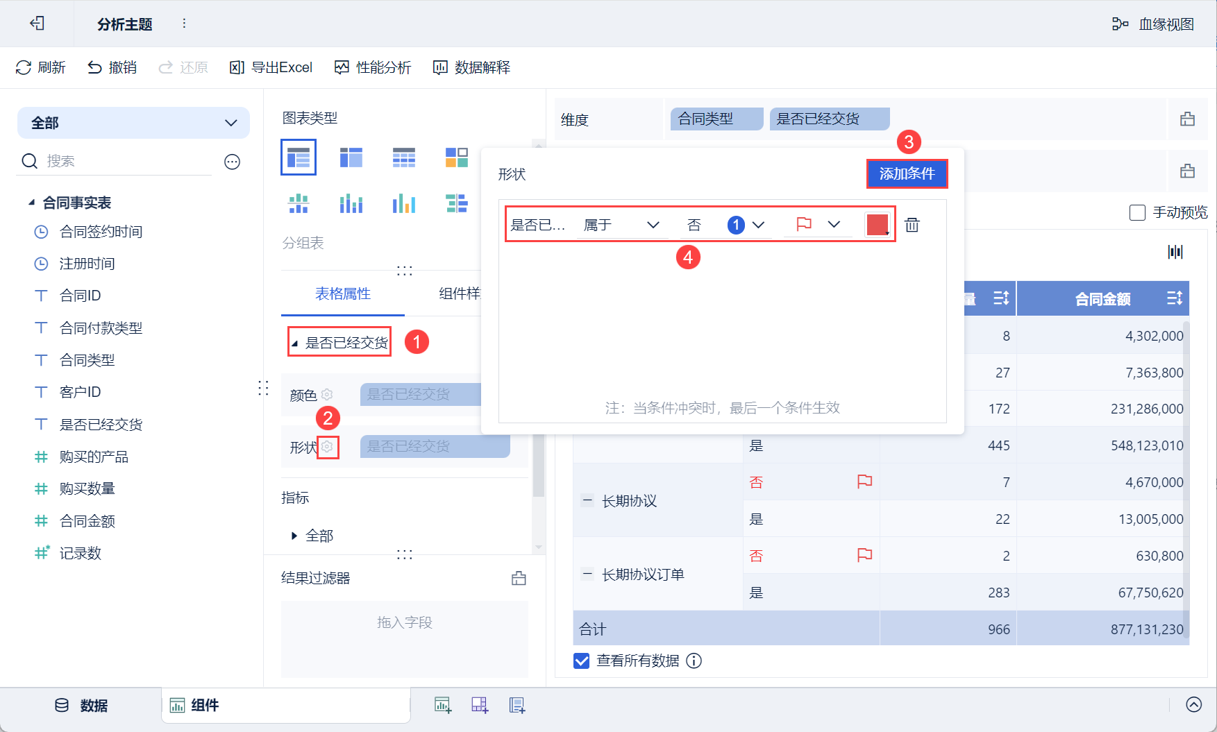 • 将左侧待分析区域的「合同金额」拖入「表格属性>指标>合同金额」中的「形状」栏。