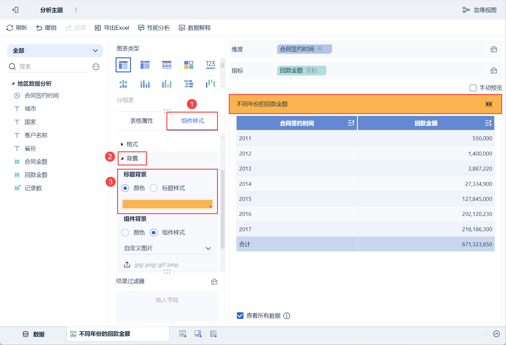 2)例如,设置标题「不同年份的回款金额」的背景为橙色,如下图所示: