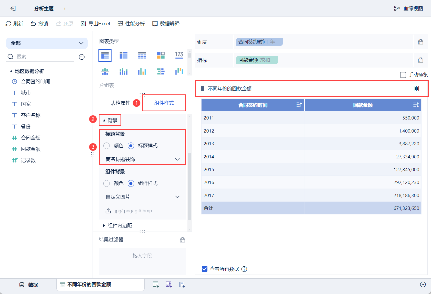 5)点击左下角组件旁的「⁝」,选择「重命名」,重命名组件为「不同年份的回款金额」,如下图所示: