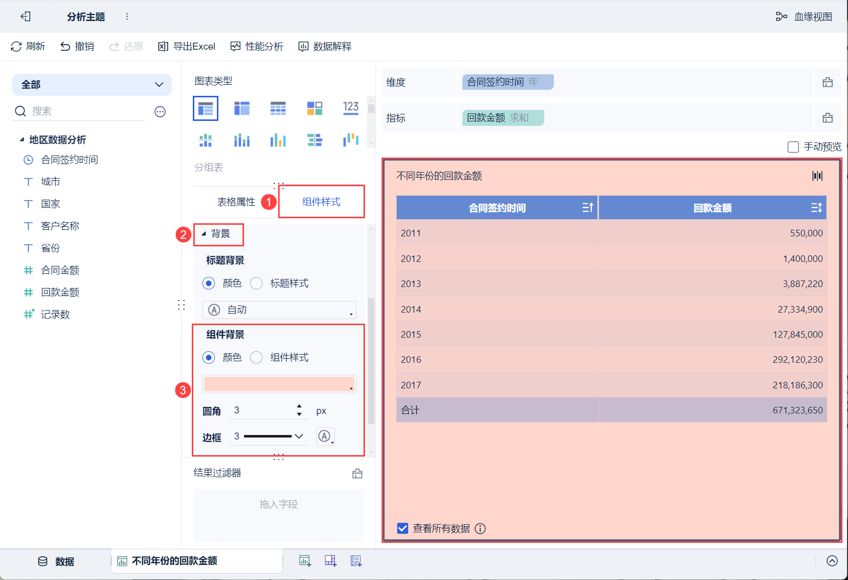 2)例如,设置组件背景的颜色为粉色,圆角为3(支持输入0-6的整数),边框为3(支持选择0-5的整数),如下图所示: