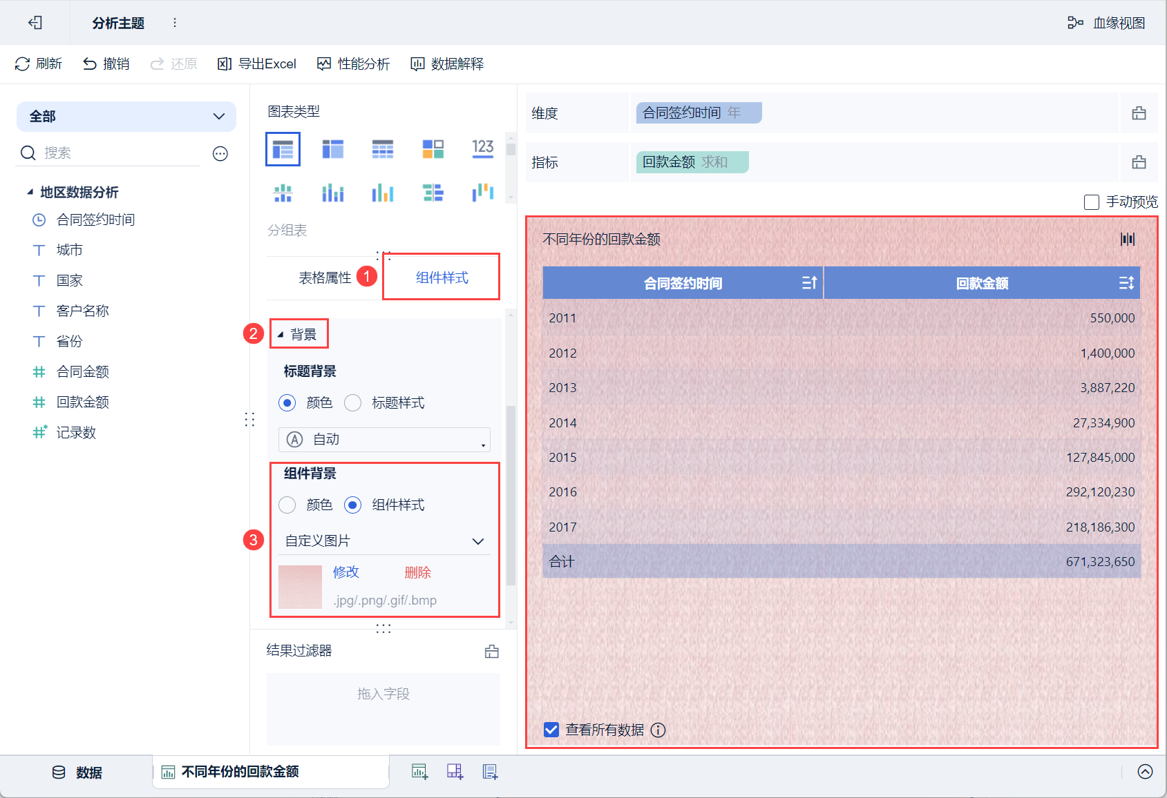 点击「组件样式>背景」,可设置组件「标题背景」和「组件背景」。如下图所示:
