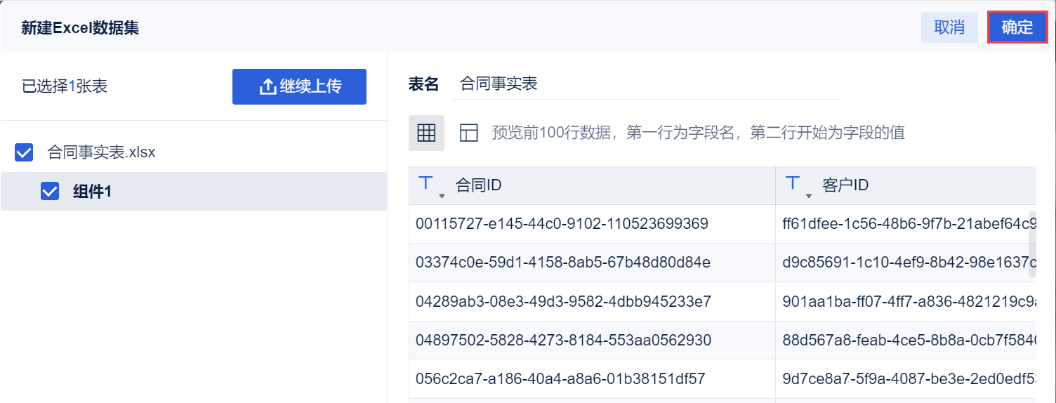 2)点击「本地Excel文件>上传数据」,上传表数据。如下图所示: